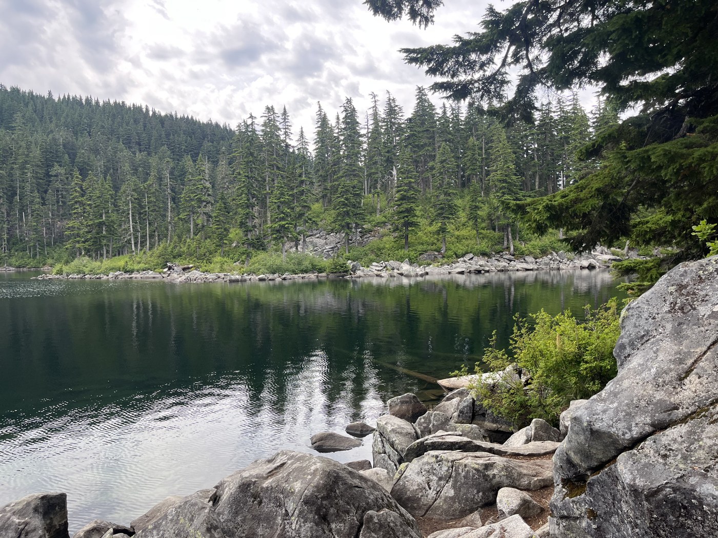 We rested for a leisurely lunch, without too many bugs. It was warm with high clouds. Swam in the delightfully cool, not cold lake. Dried off and headed back. After a short ascent, the trail was a steady descent all the way back. A light rain began to fall about a mile from the trailhead. We were back to the car by about 3:30pm. Highly recommend this hike!