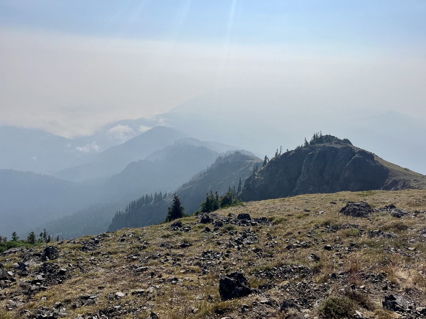 From the trailhead, the trail climbs steadily up to the summit. Smoke was intense and made the initial 3 miles through the forest difficult. Tons of wildflowers along the route and even with the smoke, the views were fantastic.