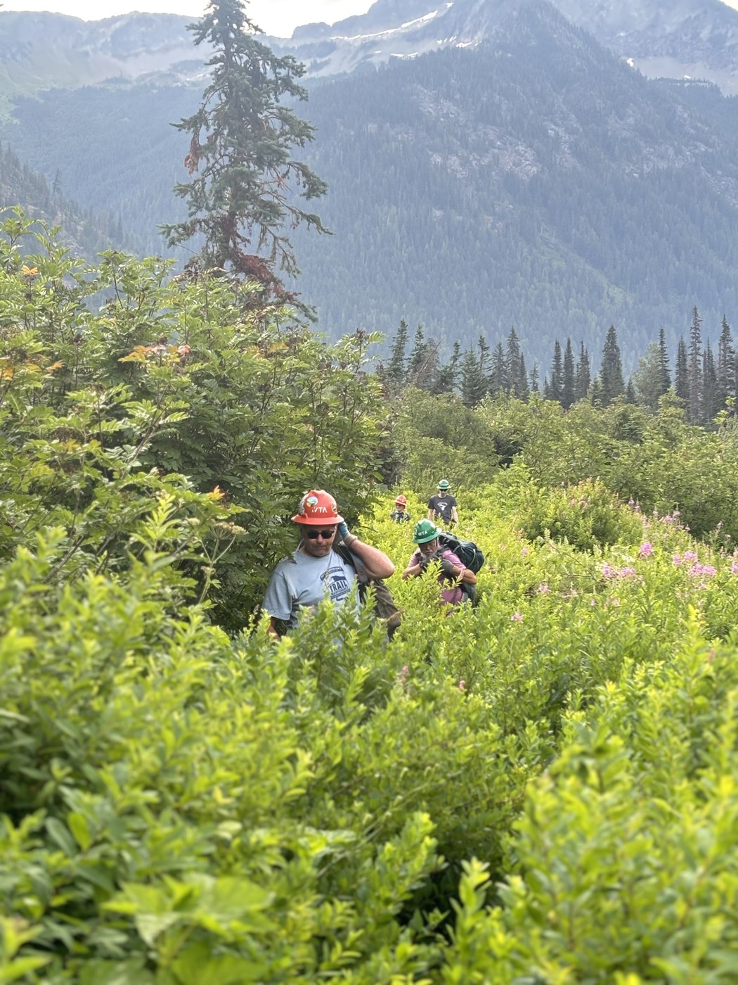 Friday we all headed out to where we left off at yesterday and having walked through the areas we worked on last year we decided that our time and energy would be better used if we focused on the woody stuff growing into the trail- Vine Maples, Alders, Hawthorns, and some what we think were Red Osier Dogwood. About ½ mile from the stream crossing are two 25 inch logs crossing the trail which are hard to get over, one you have to sit on to get over. About 11 today we were greeted by a welcomed sight, Mike the Pie guy!!!! He hiked us out with some Marionberry Pie, raspberries, chips/ salsa, and a Bulgarian Pepper which we said WTA required gloves, safety glasses and a waiver (waiver was left in camp for us to sign before we ate the pepper). Mike visited our crew last year with Pie on this trip as well. He did let us know that he was touched by some brush on his 5+ mile hike in to get to us. (He was joking of course!) https://www.wta.org/news/signpost/pie-guy-delivering-smiles-to-the-backcountry-one-slice-at-a-time After lunch four of us headed back down the trail to work on an area that the rogue hiker had worked on to make that area of trail even better. On our way we encountered two gentlemen and their three horses letting them know that the trail ahead is not passable for stock at all. They even had trouble turning around in the widest spot on the trail. They ended up making camp not far from the Boulder Pass Junction.