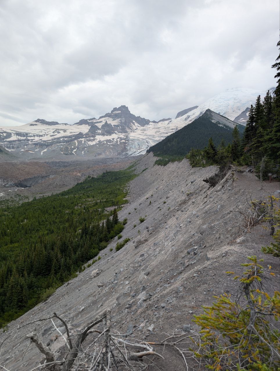 Camped at White River campground. Headed out around 8am, not too crowded. A bit steep and and scree-y after the river crossing to the get up to the ridge. The end of the maintained trail is marked clearly with a sign. Up on the ridge there are great views of a beautiful lake and of course the morraine.