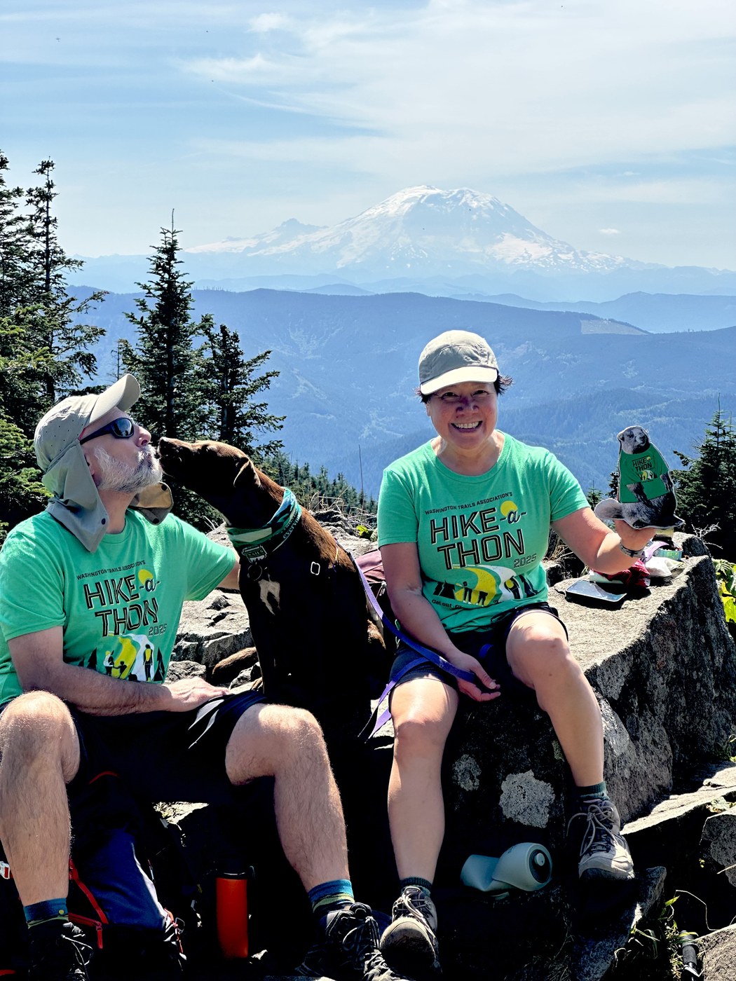 LOST & FOUND: (1) We grabbed the green, long-sleeved shirt mentioned in the last couple of Trip Reports. It’s in Seattle now and closer to its owner. (2) We also found a gray tank top, size medium. (3) To the person who dropped all those pistachio shells at the lunch boulder with the view of Mount Rainier, I picked all of them up for you.
