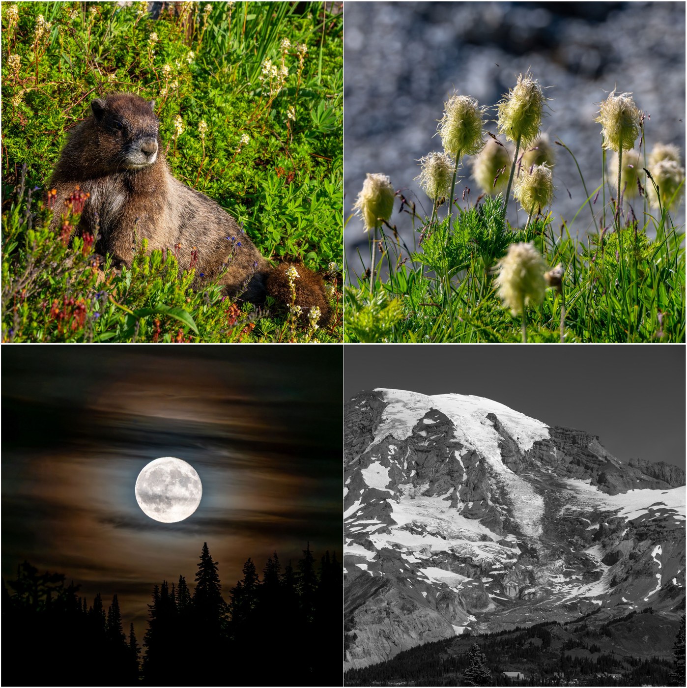 - Trail: The short trail up to the saddle is exceedingly well-maintained and short - 1.3 miles each way with 1K ft vertical. The trail starts in the woods with areas of flowery meadows, and eventually ascends via a set of switchbacks on a talus slope below the shoulder of Pinnacle Peak. The views of the southside of Mt Rainier, right above Paradise, are outstanding. Lots of curious marmots and pika that seemed used to people (!) The (north) view from the saddle itself is more limited (the saddle being essentially a cut in the ridgeline) so we took the unmaintained trail east, looking for a way to scramble up Pinnacle Peak. We scrambled to a cut in the ridgeline we called "The Keyhole" - L3 with quite a bit of butt action on the descent. There was very little room at our chosen perch - just enough for two of us and our backpacks - and I was not convinced it was not going to crumble into the abyss on the other side! (we thought we were scrambling up to a flat top, but it was more like a knife-edge ridge). Great views of Mt Adams and Mt St Helens to the south as well. We scrambled down in the fading twilight, and then used our headlamps to get back to the trailhead, as the moon did not rise until we were almost down. NOTE: Trail is inside Mt Rainier NP so dogs are not permitted. Also, you can see "The Keyhole" from the switchbacks on the ascent - it is an obvious small gap in the rocky headwall.