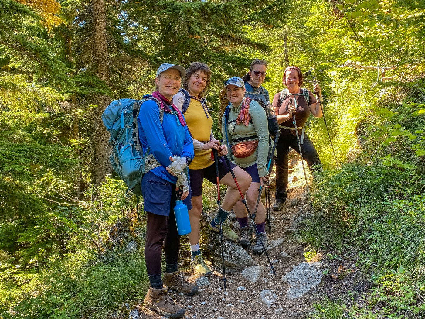 6 of us from the Mountaineers CHS (Conditioning for Hiking Series) cohort had the trifecta of highlights: beautiful fall foliage just starting up high, abundant ripe blueberries and huckleberries for noshing in the basin, and wonderfully cool water for swimming. Add a fourth: two sort of unusual birds, an American goshawk I've heard several times around mile 2.5 this summer, and a belted kingfisher at Rainbow Lake, and the trip was a winner.
