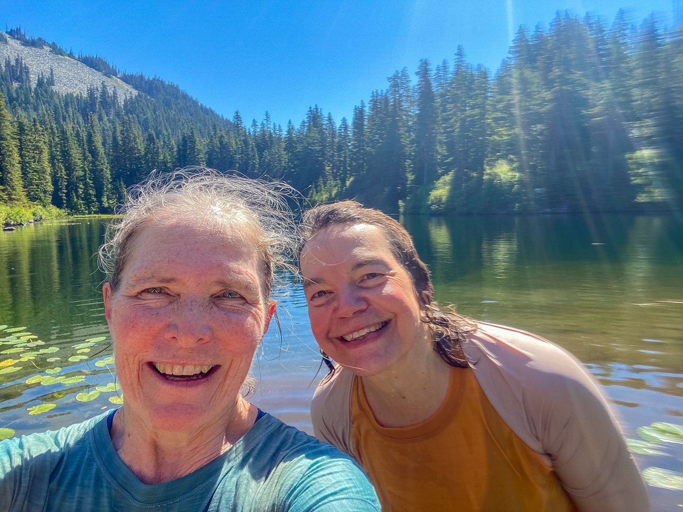 Despite 90s in Seattle, we braved the heat with an early Tuesday start (before 7 a.m.), took lots of breaks, and enjoyed an hour at Rainbow Lake and 15 minutes at Island. The light breeze did wonders for our spirits, and shade trees, a beautiful comfortable trail and gentle gradient, and (bonus!) extra water (I carried an extra gallon) were all welcome elements of this hot hike.