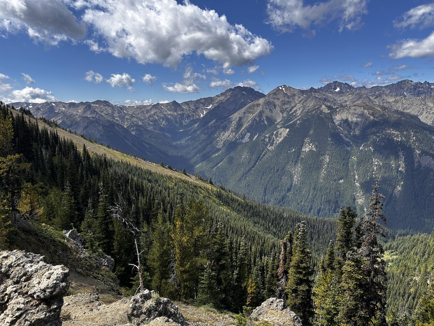 While the spectacular wildflower blooming season is over, we still enjoyed blooming aster, rangers button, shrubby cinquefoil and common harebell. The huckleberries were abundant and delicious. The horse flies were an annoyance higher up the trail until the wind picked up at the pass. The trail is in pretty good condition. WTA has not worked on the trail this season so there are places where it is really brushy, there are logs across and into the trail but only one log that requires more than a step over. Hydapse fritillaries (a butterfly) were super abundant; a sooty grouse and her chick were foraging very close to the trail and red crossbills were flying over the pass looking for ripe seed cones. It was a great day for a hike!