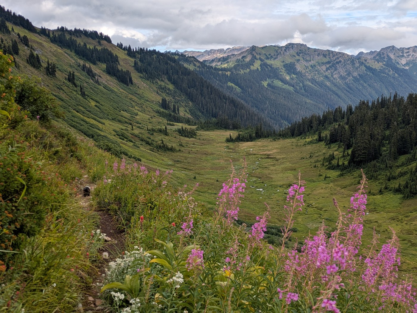 Day 1: Quartz Creek TH (road is good - if you have a sedan, take the little rocky section just before the Blanca Lake TH slow, but it's fine). Took Quartz Creek up to Curry Gap and Bald Eagle Trail. Got water at Curry Gap - there actually were a few good streams after Curry Gap, but we were not expecting any. The chill grade was so pleasant and the trail was in great condition! Misty moody PNW day still with some pretty views! Got to Dishpan Gap and did a little loop round Meander Meadows, which was showing off in all its glory. Still some wildlfowers and SO many blueberries (and some huckleberries!) along the whole trail. We also saw at least 20 marmots (and a few pikas) over the two days! Somehow no bears, which was baffling, because I would absolutely live here if I were a bear. One could get water at Meander Meadows, but we headed to Sally Ann to camp. The lake was perfect (and not even really cold) for a dip and there were at least a handful of good camping spots. The toilet, however, is getting quite full!