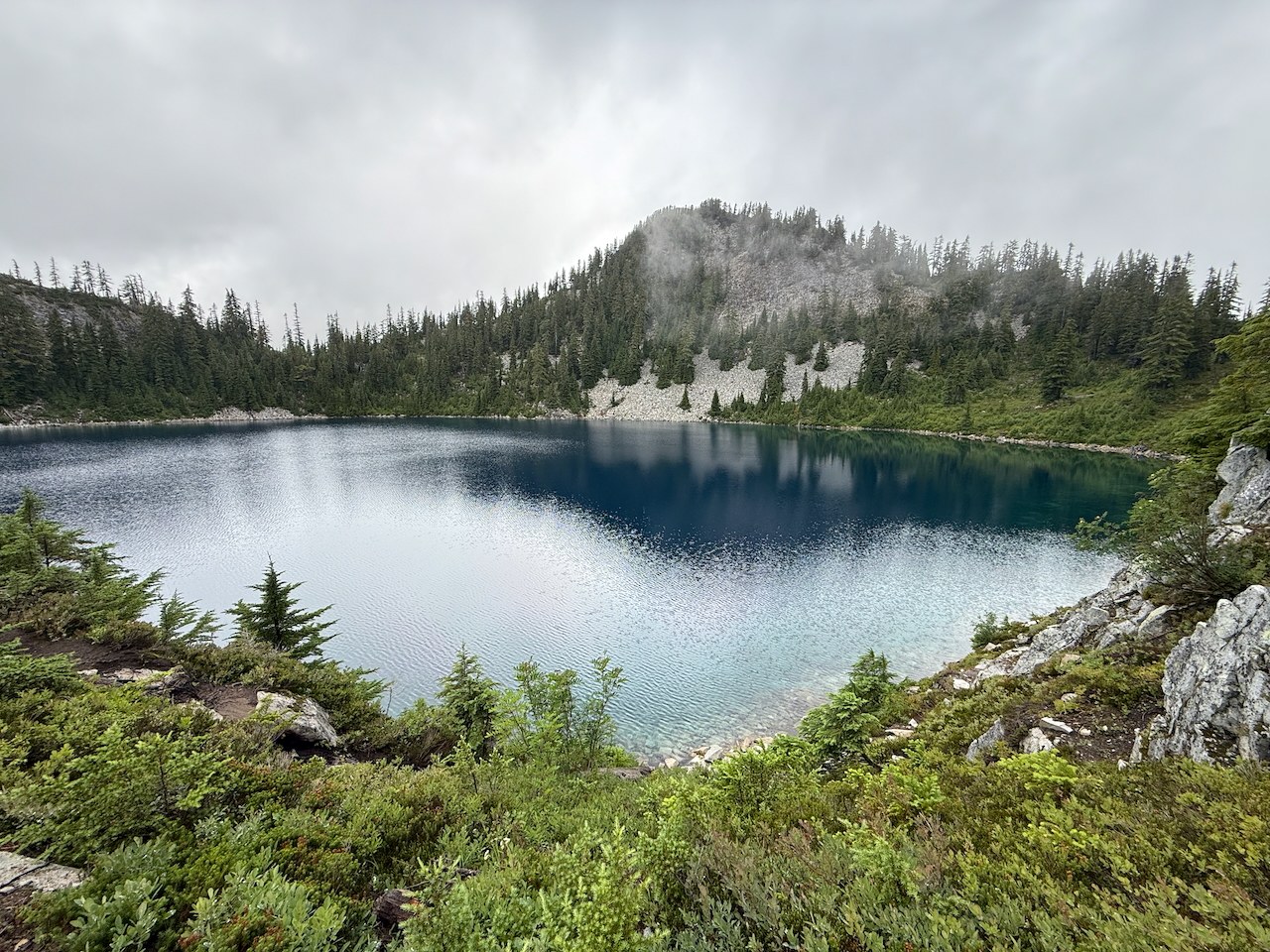 Began our hike at 7:45 am on Saturday. 51F outside with low clouds and wispy fog at start. Roads from the interstate to the Alpental parking lot were passable for all cars. Parking lot was ~25% full when we arrived and full when we returned at 12:45 pm. The trail to Snow Lake is well-marked and well-maintained. Approx 1,280 feet of elevation gain over 3.23 miles to the lake; the climb is slow, steady, and more approachable than the steeper ascents along much of the I-90 corridor. We continued to Gem Lake, arriving about an hour later after traveling the additional 1.9 miles and 960 feet of elevation. Great colors in the lake and far fewer people here than at Snow Lake. There were 2-3 forks along the path from Snow to Gem that were not well-marked, but we were able to find our way by choosing a direction, continuing 10-20 feet along it, and assessing whether we could clearly identify the path continuing ahead.