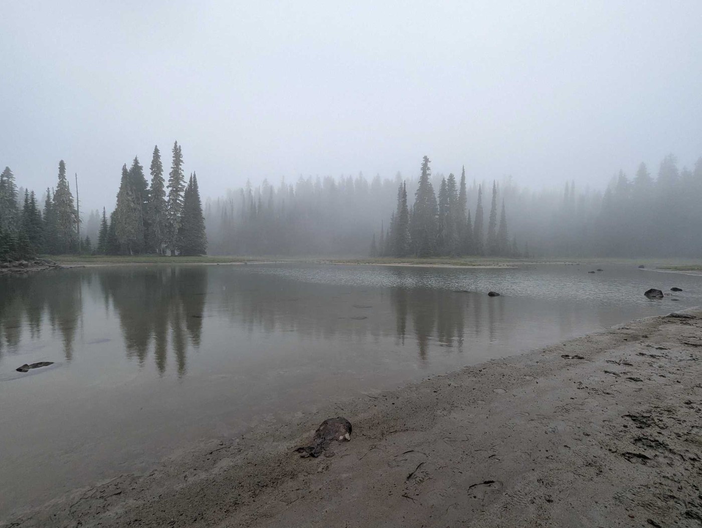 this was our original backup plan, pivoted to once the forecast indicated rain- ie minimal views. we got wet from mist and some steady periods of light rain, although it never rained hard. weather may or may not have helped with bugs. noticed more near deer lake, although they weren't awful, but noticable when we stopped. sand lake looked moody with fog and we enjoyed looking at all the prints in the sand (mostly dogs but maybe a few others ). saw only a few other hikers- including a larger group of young men returning from backpacking when we parked. a few flowers still sticking around like lupin in meadow areas near the lakes.