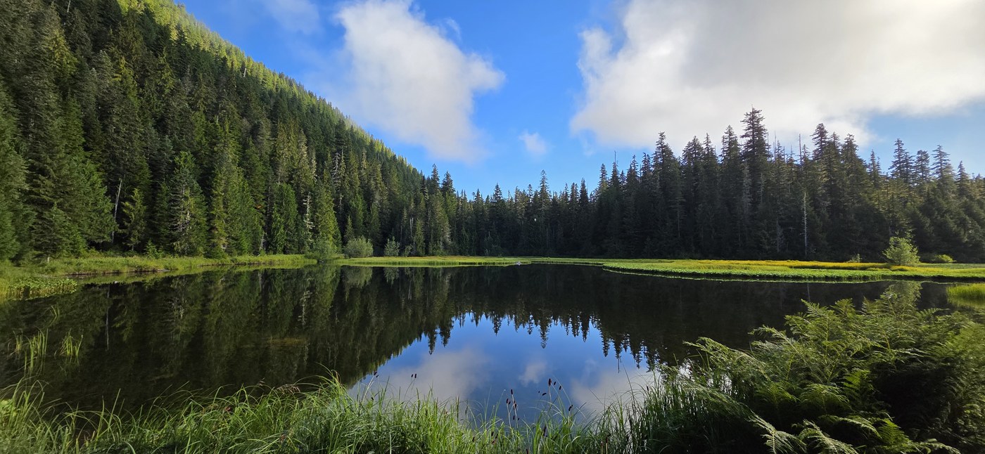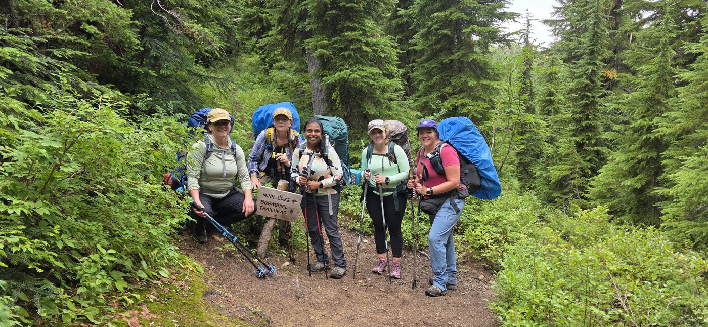 The trail is pretty straightforward. There were a few blowdowns. Most were easy to cross but there is one with all its branches that was posing a problem. We were getting stuck with our huge backpacks. We noticed people were walking around it but please be cautious as there's a huge drop. This part of the hike had huge drops throughout. The bushes are overgrown and we had to do some bushwacking. We met a Ranger just as we reached Mink Lake. She quickly checked our permits and asked for anything she needed to be aware of on the trail. We told her about that one big blowdown and she said she would try to trim some of it on her way up. Extremely grateful to the Rangers for what they do. We noticed tiny froglets that might have just hatched jumping on the trail near the lake. We were cautious not to step on them. The lake was beautiful. My friend had her fishing pole and decided to go fishing. We were happy it wasn't raining. The campsites are great here and very spacious. There's a sheltered area near the campsite and the ranger told us that it was for emergencies. There is running water next to the sheltered area. My Garmin recorded 7.22 miles and 1,270 feet of elevation gain.