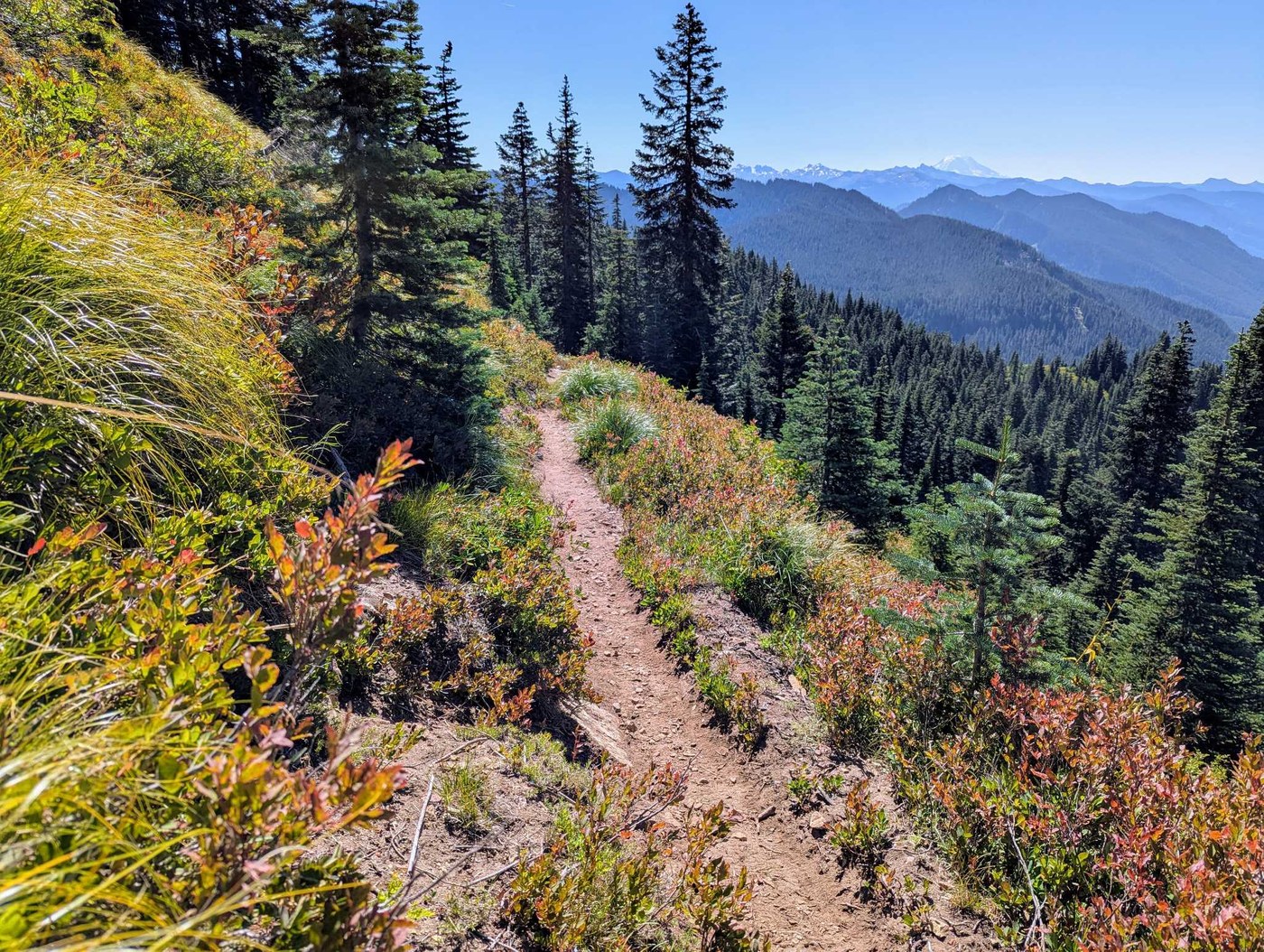 There is currently a fantastic section of ripe huckleberries that starts about three quarters of a mile before the summit. The berries are at or near peak, they are copious, and in many spots can be reached without even bending down due to the bushes being in the hillside uphill of the trail.