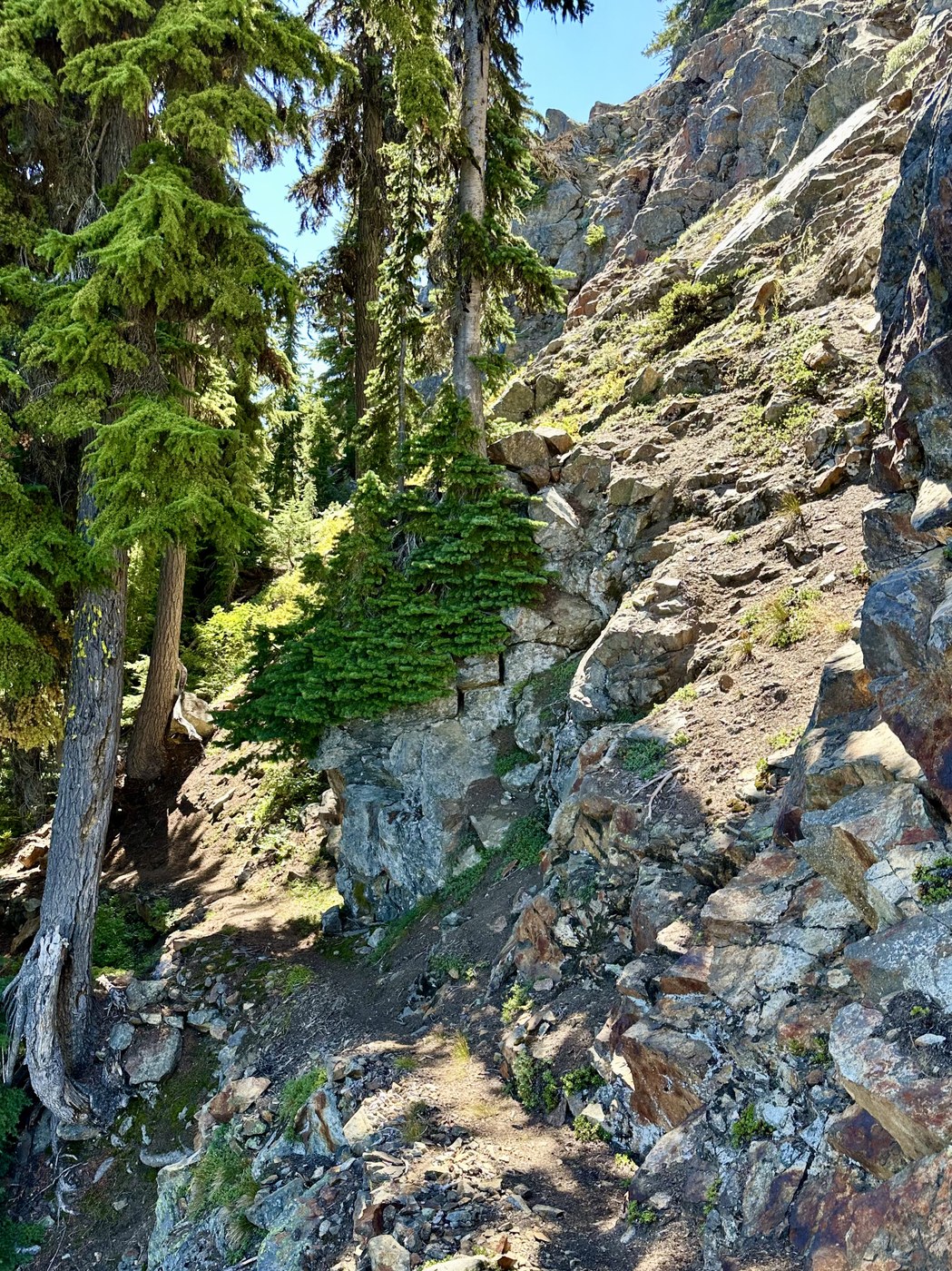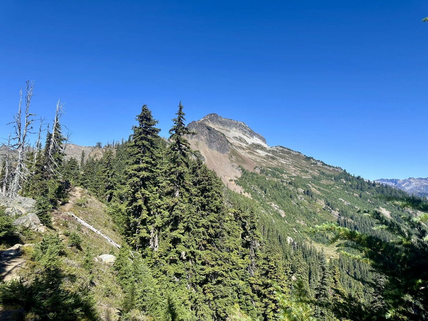 While this is a walk up, not a scramble, there were some sections where a misstep would be a serious problem. Much of the last few miles is on a narrow path that traverses steep slopes. Basically a class 1 with consequences. Take particular care in the stretches where the trail surface is loose and unconsolidated, especially in poor weather, and when descending.