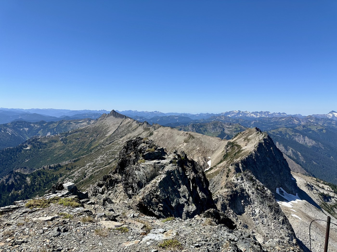 The summit was spectacular. It offered a panoramic viewpoint for every nearby peak and many distant ones as well. The drop off to the adjacent valleys presented a unique perspective. The summit register was worked over and barely legible. It would benefit from some waterproof paper sheets from a future hiker and probably a pen. The wind kept the insects at bay and allowed for time to enjoy the scenery before descending.