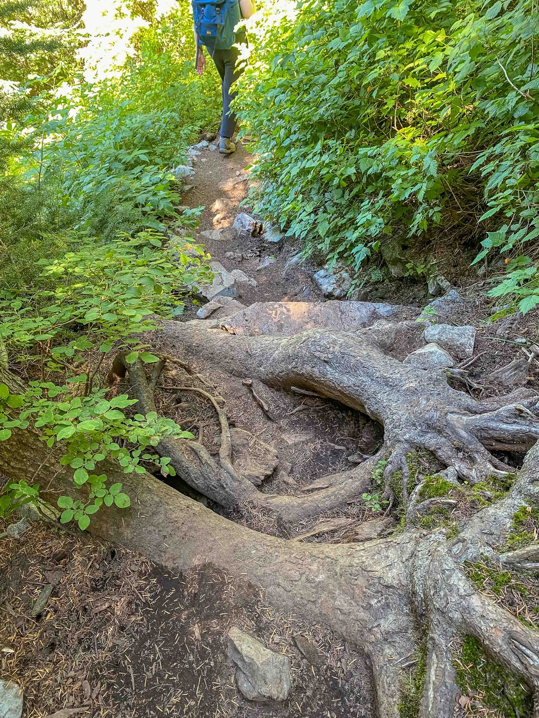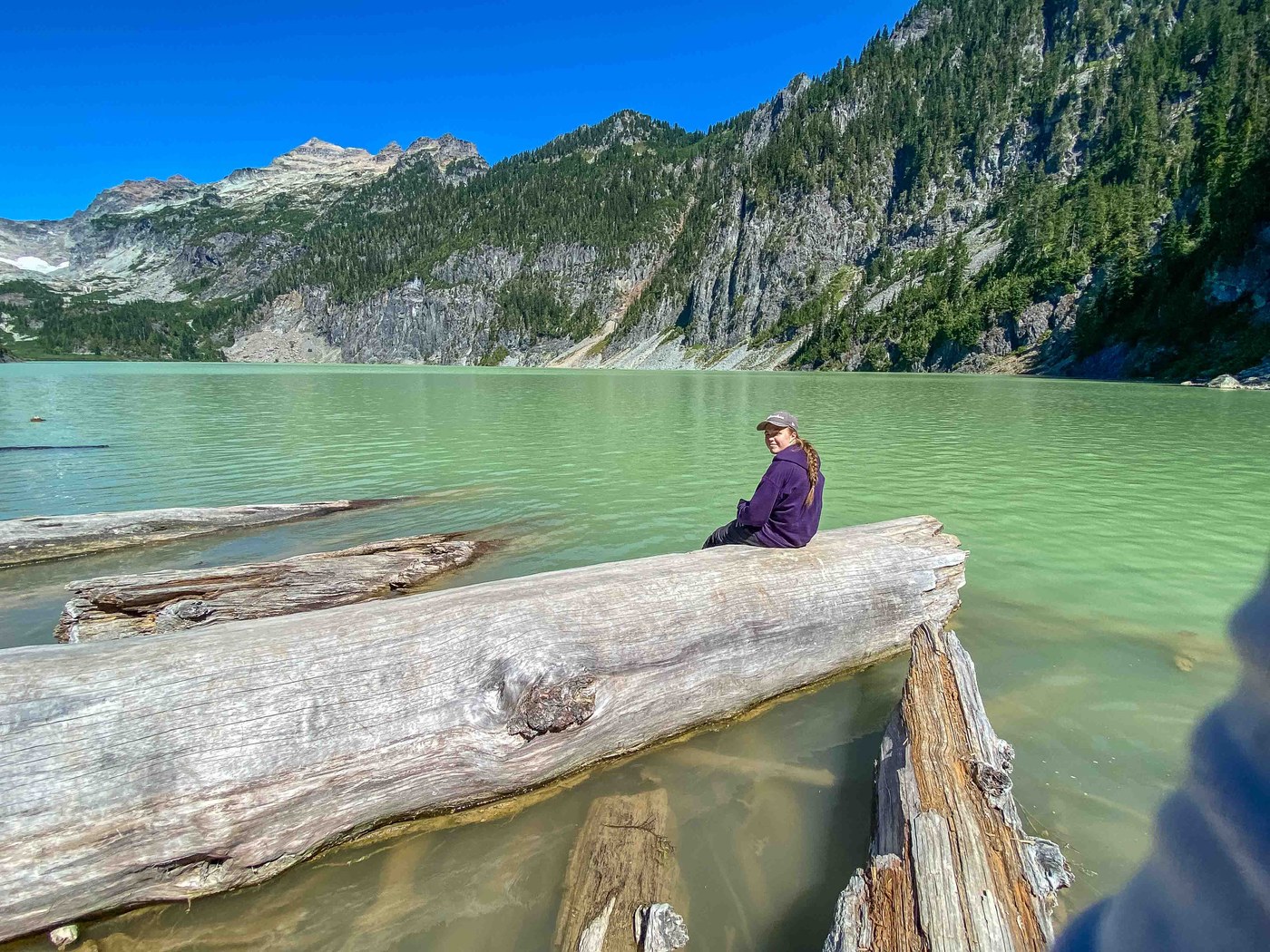 Lake experience: I’d only done this trail once, four years ago, on a foggy, overcast day that didn’t give us any view until about 5 minutes before we reached the lake when we got a partial clearing. I hadn’t remembered as many logs along the shore; looking at pictures from then I can see we were decked in hats and rain gear so no need to wade. Friday, however, with a heat advisory in Seattle, it was a different story. My daughter and I found a way to cross some logs and dangle our feet but I smelled sulfur in the mud and wasn’t sure I wanted to go swimming. Others were more fearless.