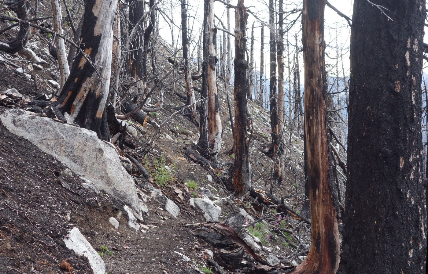Descending from the ridge the next day on the newly opened trail, there are a couple of miles of trail that are overgrown with ferns and huckleberry bushes. It wasn't hard to follow the trail, but it required paying attention. The trail goes through some burned areas, marked by charred tree trunks and abundant new undergrowth. Partway down from the ridge, I came to a section where crews have been clearing the brush and making new treadway. It was an odd sensation, walking on soft, newly disturbed dirt that hasn't been packed down yet by the boots of dozens of hikers.