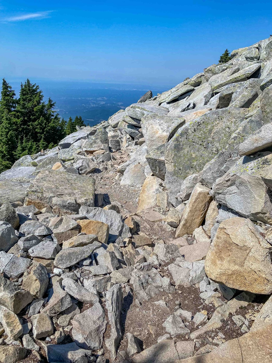 Canine companions: My family and I took my dog and met two friends for an 8:30 start and boy, were we ever glad for that extra half hour of cooler conditions (original plan was 9 a.m.) There is little in the way of running water, but my dog found the 3-4 places where there was a trickle to supplement the water we brought. I was surprised at the number of dogs doing this hike; we stopped at the boulder field leading to the lookout tower as my 45-pound dog is too heavy to hoist up and he doesn’t do ladders that well. I was worried about my 10-year-old Labraheeler but he did fantastic and last summer’s limp never showed up this year.