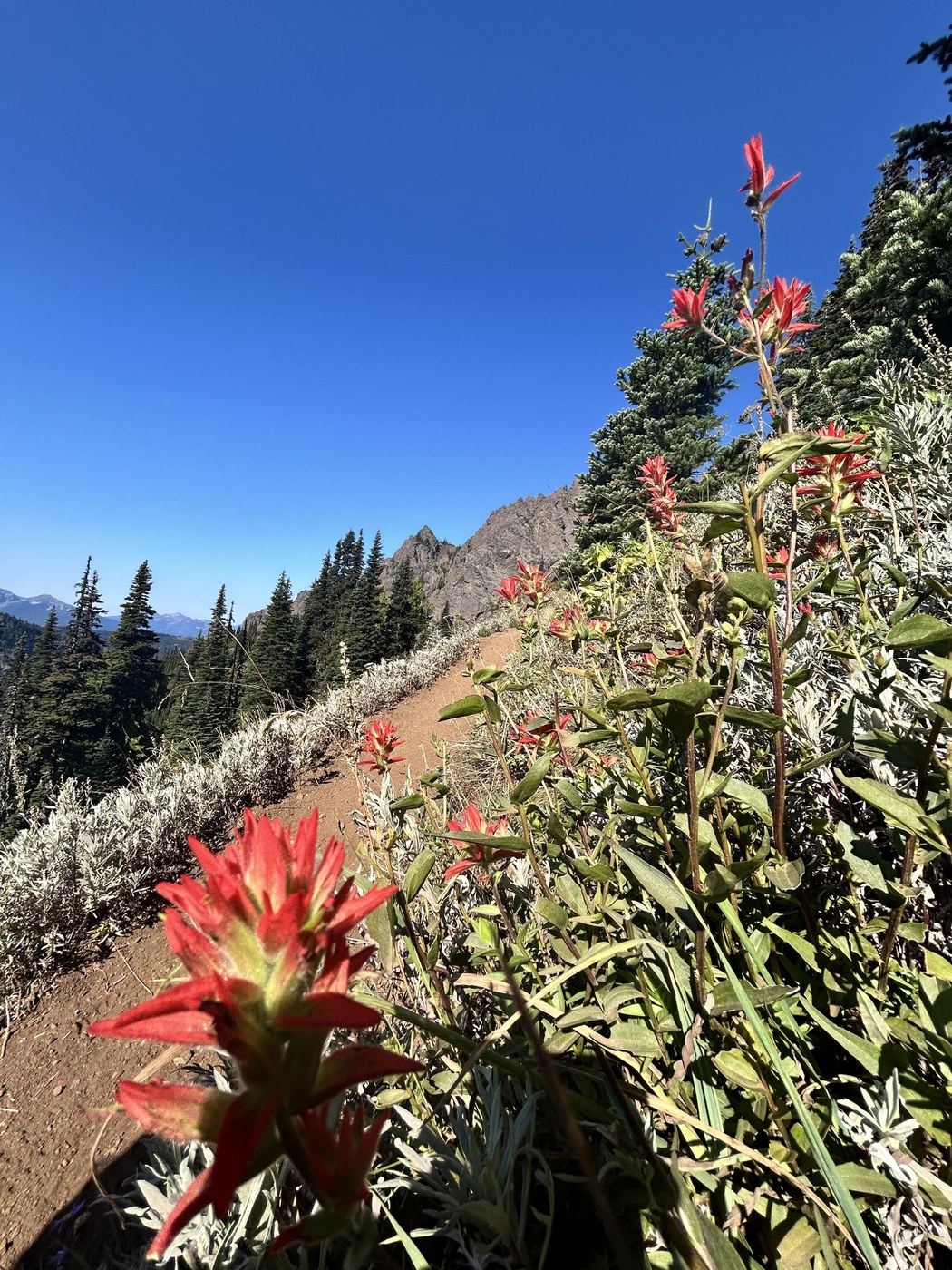 Continuing on the Klahhane Ridge trail, there were only 2 small areas of scree. Otherwise, it was dirt (and dusty but manageable - but wearing gaitors would be helpful), which made for the return down slower than we anticipated with the pitch and a bit slippery in the dust.