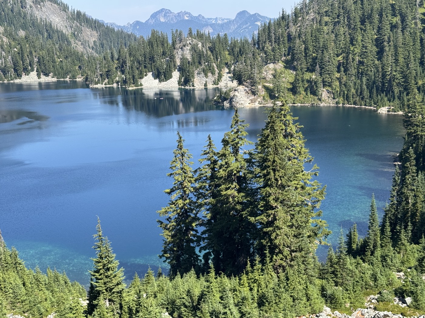 As part of my USFS volunteer job, I regularly participate by hiking on trail patrols. Yesterday, I hiked to Snow Lake. Fortunately, I arrived at the TH at 8:15 when the heat was not bad. Unfortunately, given how long it took me to pick up all the trash I encountered on the trail (including 8 dog poop bags, pee detritus, beer cans, plastic bottles, red bull cans, and a paper bag full of old lunch items), I did not descend until late afternoon when it was REALLY HOT. That said, I did take a nice dip in the lake. So delicious.
