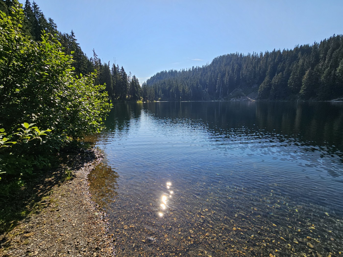 The lake is beautiful. Very clear water and a reasonable temperature for swimming. I saw a river otter swim by. The otter seemed to wonder why I was disturbing its morning. There was one big biting fly that did not appreciate me either.