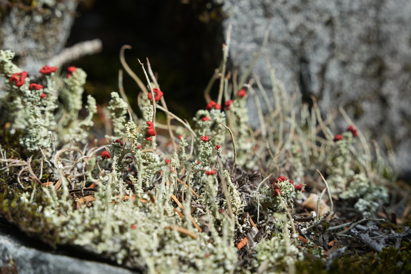 The trail to Comet Falls starts off with good tread, and then it's all rocky and gets a little steep too. You pass through a talus field with basalt columns, and pika chirping and playing hide and seek. There is a dense group of vine maples here and they will look beautiful in the fall. Also quite a few yellow cedar trees, including young ones just next to the trail. If you look carefully at the rocks here, you will also spot British Soldier Lichen.