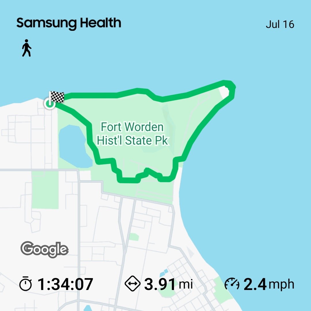 It was a beautiful, clear, sunny day and the tide was out. We walked along the north beach looking for pretty pebbles and admiring the beautiful glacial stratigraphy on the bluff face. While walking the shoreline, a Bald Eagle swooped down and plucked a fish right out of the water not more than 20 feet away, a breathtaking sight. The tide was low enough such that we could walk in sand all the way around Point Wilson. We stopped and checked out the lighthouse, which was closed. We walked along the south beach past the campground to the little store, the Cable House Canteen, where we picked up a couple cold canned drinks. We chatted a little with the campground host who handed out a couple treats for our two dogs. Then up the hill we walked to the main Fort Worden area with all the former barracks and other buildings. A mobile coffee stand, Java Gypsy, was set up there. We bought a couple iced mochas from them and sat down at an outside table at the Common (which also has nice restrooms). From there we walked through the forest campground and picked up the Chinese Garden Trail back to North Beach County Park.