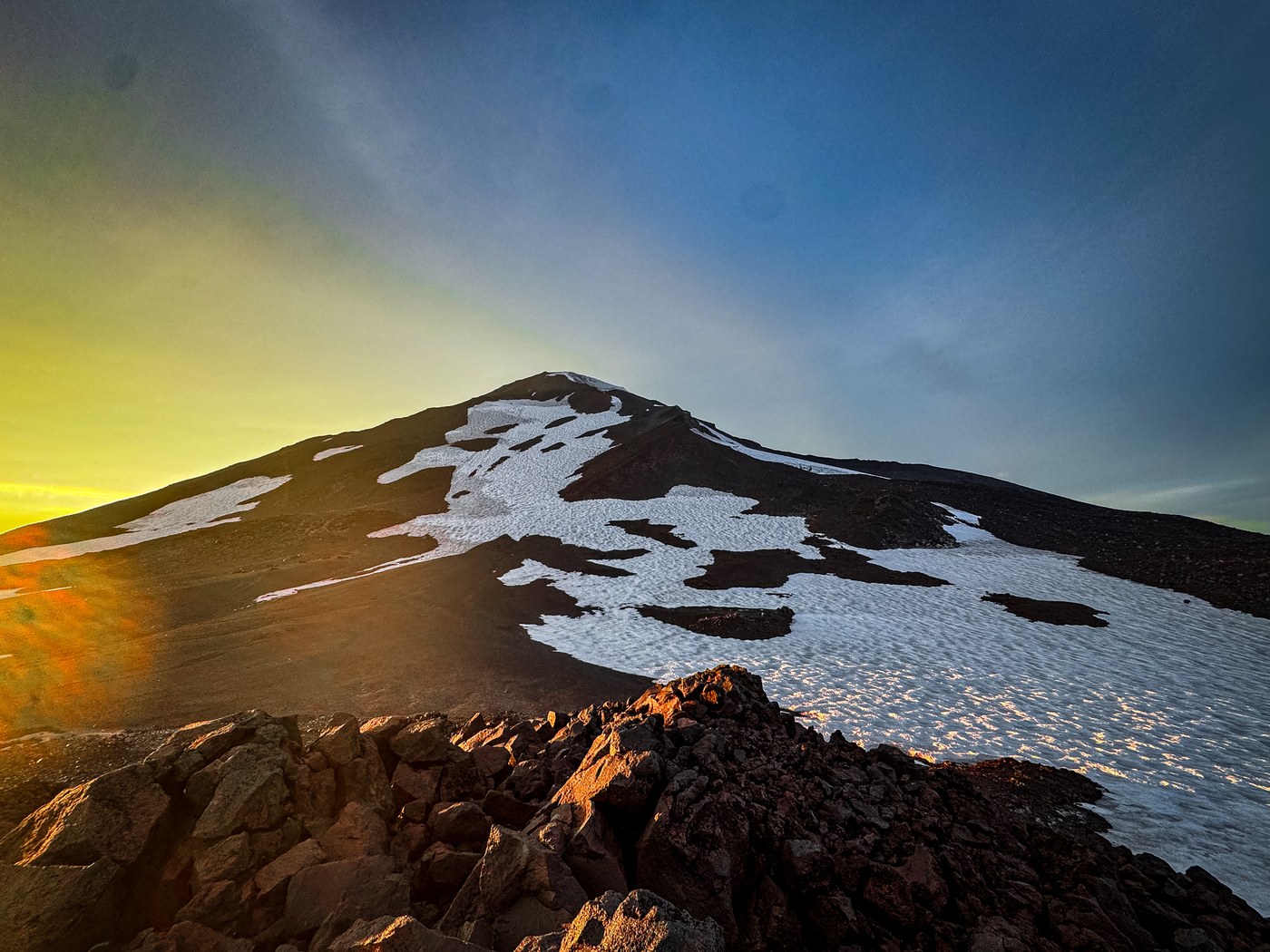 At 7,500 feet, the trail steepens as you leave the burnt forests behind and pick your way through talus fields. The route finally switches from rock to snow at 8,300 feet. Crampons are unnecessary here as the slope is mild and the snow at this elevation is quite soft. I was able to make great time on the snow, and before I knew it, I had reached the Lunch Counter around 9,100 feet. There are tons of camp spots near the trail, but finding one near running water was a bit more difficult. I ended up camping a bit of trail (around 9,400 feet) near a snowfield and a small creek. Being a fair bit from the trail would later prove to be a bit of an annoyance, but the views of Mount Hood from my campsite made up for it. After eating dinner, prepping my pack, and filtering water, it was time to hit the hay in preparation for what was sure to be a long day tomorrow.