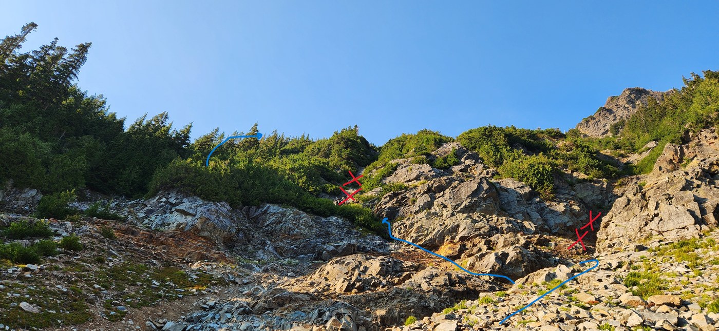 - After you cross the erosion gully do not continue up the first rocky gully to attain the ridge. Cross to the left and you’ll look for a ramp that will take you into the cedar filled gully. This is great because you basically veggie belay the entire way up and there is no danger of rock fall. On the way up we missed this and took the next gully to the left, which was doable and much better than the first gully (avoid this one). On the way down we got the correct cedar-filled gully, I did add some additional flagging that will hopefully help future climbers find the right spot (see notes on my photo).