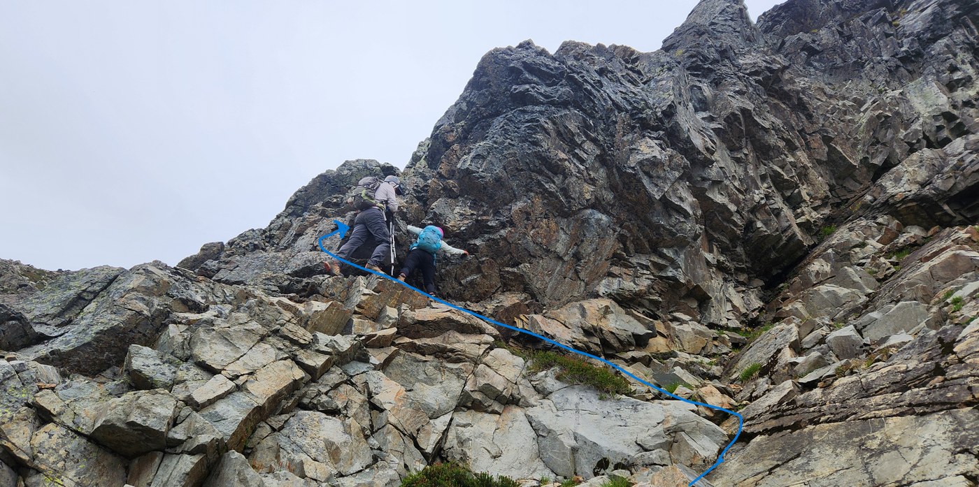 - Once on the ridge it is easy to follow the trail/route up to the final cliff band. Here is where you must pay attention! So many climbers have gone straight up the first gully that there is a well-defined trail leading you there (we did this and got part way up and realized our error). Don't go straight up!
