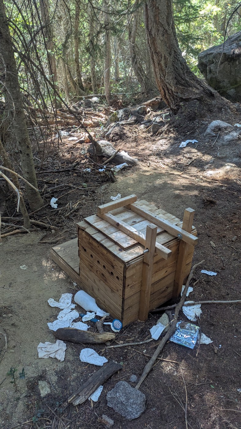 Please remember to pack out every piece of trash you bring into the forest, including toilet paper, do not dispose of things along or off-trail. Innumerable stashes of trash including glass bottles, cans, plastic bottles, food waste, and broken gear are all frequently found behind boulders, wedged under logs, or just off of the main trail. Never place trash in toilets, as it makes them unusable for other hikers.