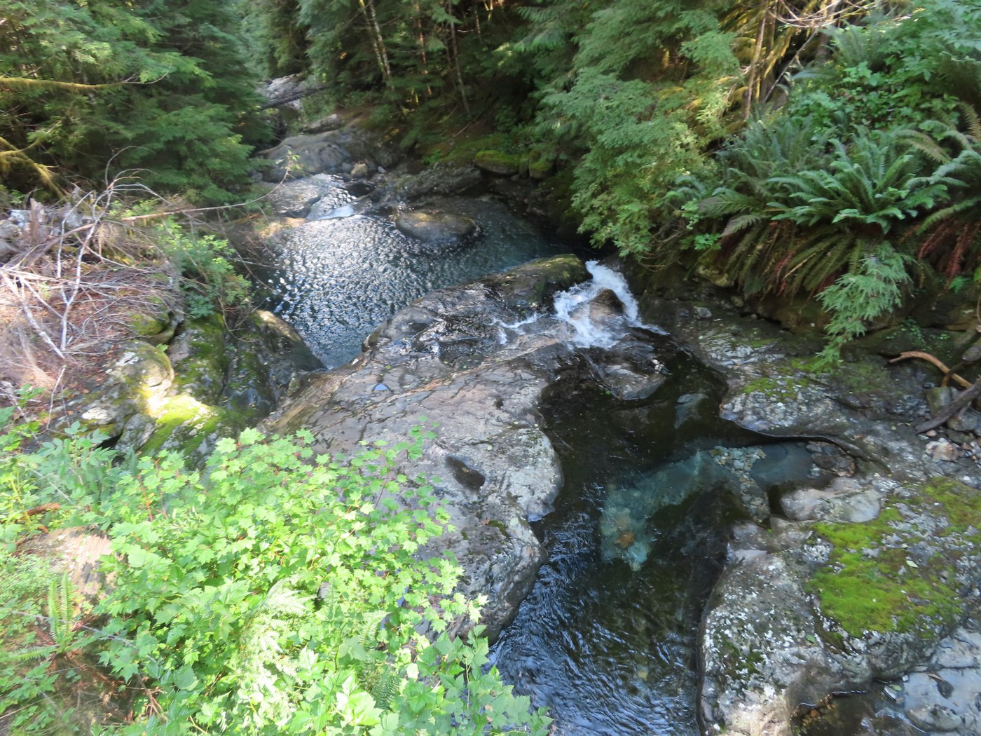 On the way back to the parking lot I met a few more hikers coming up the trail in the afternoon. The only wildlife I saw was one grouse and one large Garder snake. I stopped and checked out the PUD Nighthawk picnic site. It is a short distance off the main trail. I thought it might be another viewpoint like their Bear Creek site. I found several picnic tables and benches, but no view. You can kind of see Spada Lake downhill through the trees. The main trail on the old roadbed has many up and down sections where the culverts were removed from the road when it was closed. Some of the creeks had water flowing in them. My hike was 7.7 miles round trip. George