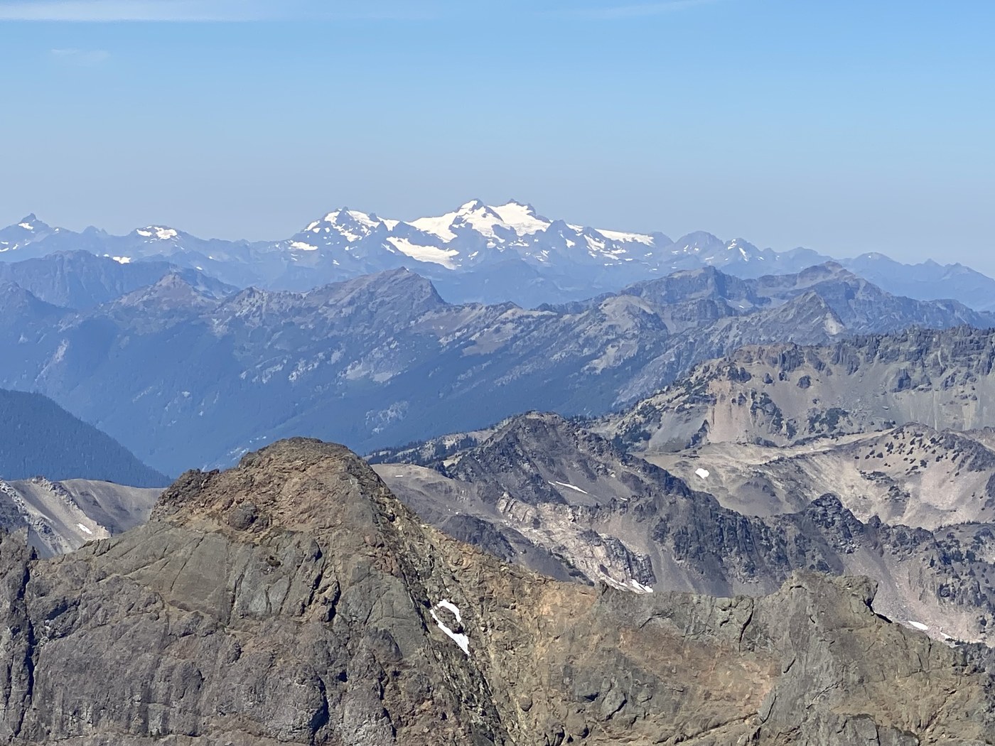 After navigating this section, traverse up to the start of the Finger Traverse. The move around the corner is the worst part. It’s very airy. From there, hand holds are great. After this, made way into bowl and located key ledge to wrap around the mountain and ascent to final summit ridge. Ridge curls all the way around until some final Class 4 at the very top. There is a rap anchor, but we downclimbed. Summit views are amazing.