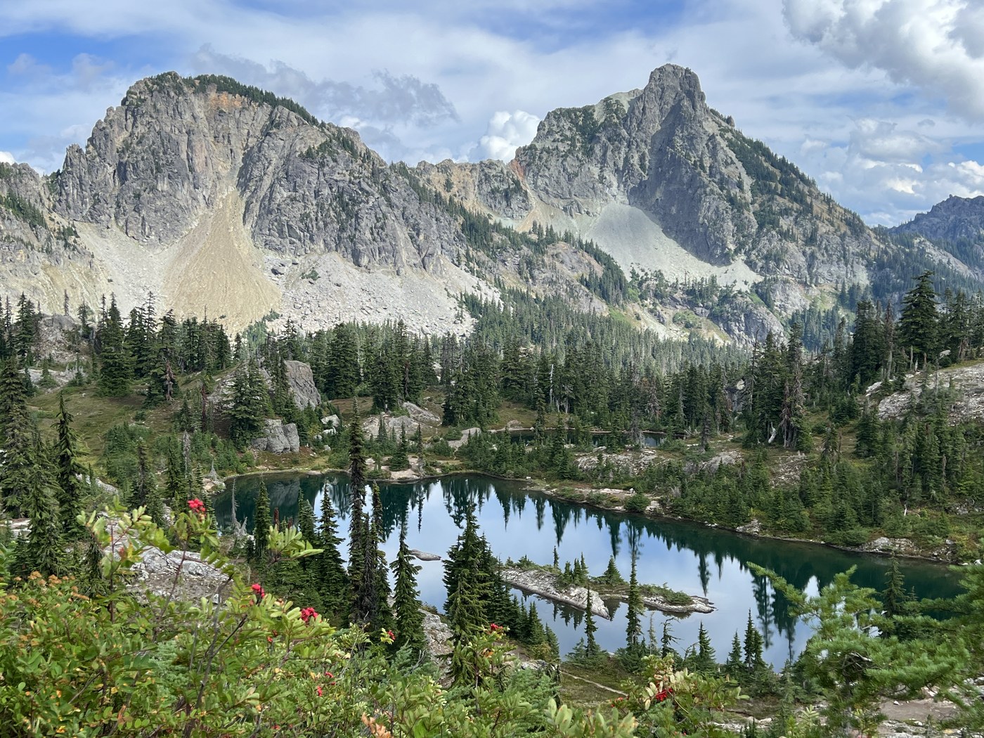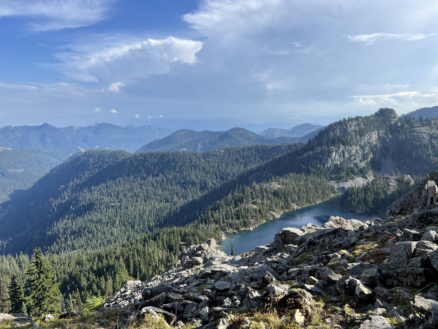 We started our day hike at 10:20 am and got back to the car at 6:30 pm. My watch clocked 6 hours of moving time approx. 3.5 hrs up; 2.5 hrs down. It was a lovely day and we made a lunch stop at Rachel Lake and then spent quite awhile at Lila Lake enjoying the solitude, the views and the berries. My Garmin watch logged 10.5 mi RT (and 3,100 ft gain), my husbands Apple watch logged 11.4 miles. And the WTA trail description says 11 miles. Take your pick.