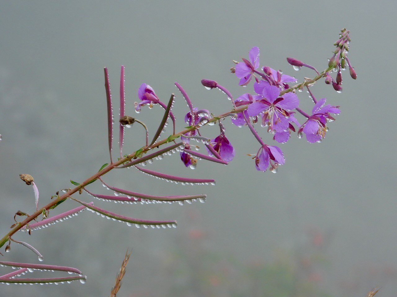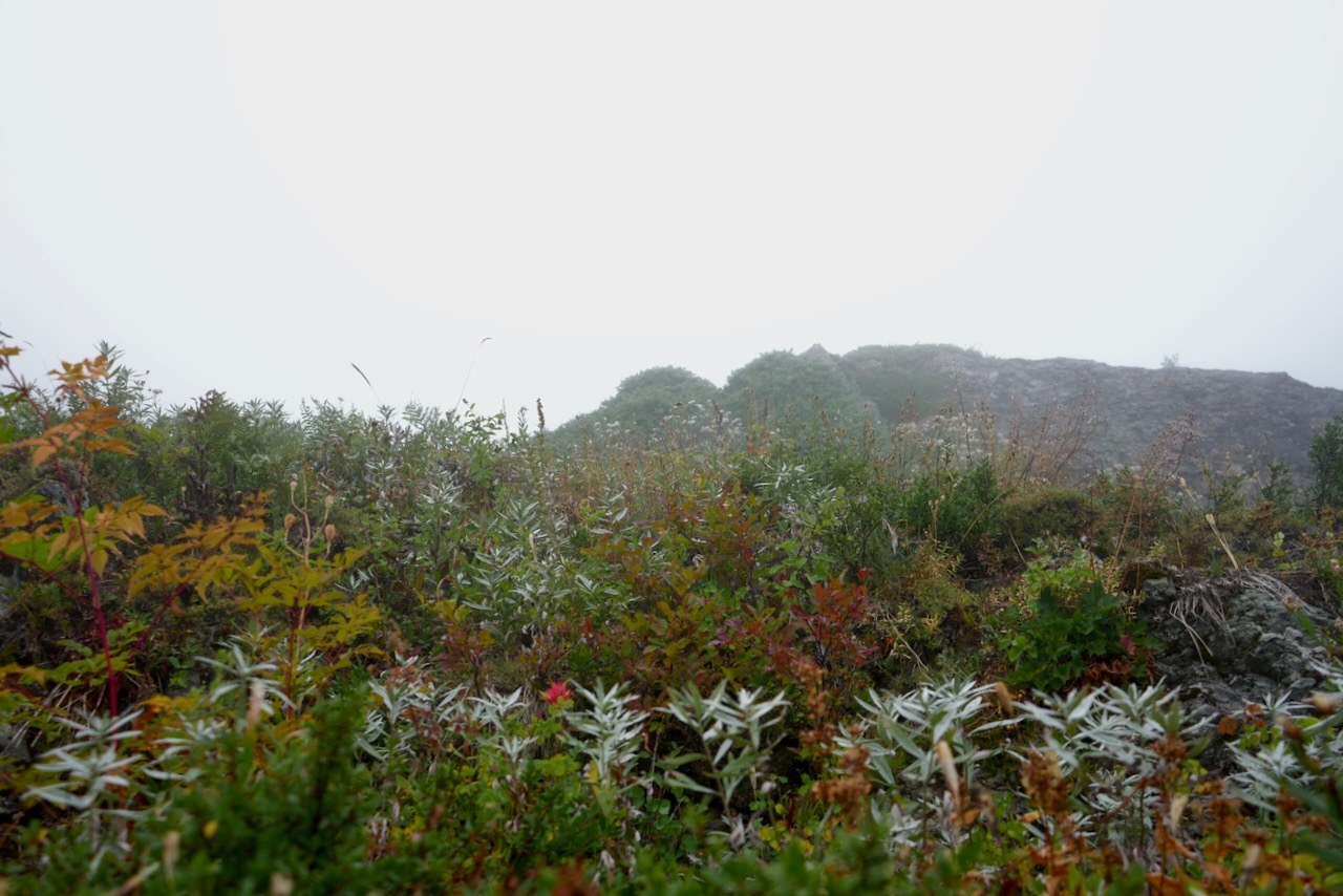 It was foggy the entire time I was here. I was hoping the sky would clear but nope, not today. This caused me to focus more on the vegetation and animals that could see. The hillsides are packed solid with plants and flowers that are displaying muted fall colors. If it had been sunny the colors of the plants would have been entirely different. Lots of birds seen mostly foraging seeds. I saw several marmots and pikas. No views at the top nor could I see the lake. I descended toward the lake but I gave up when it became clear that the fog was not going to lift.
