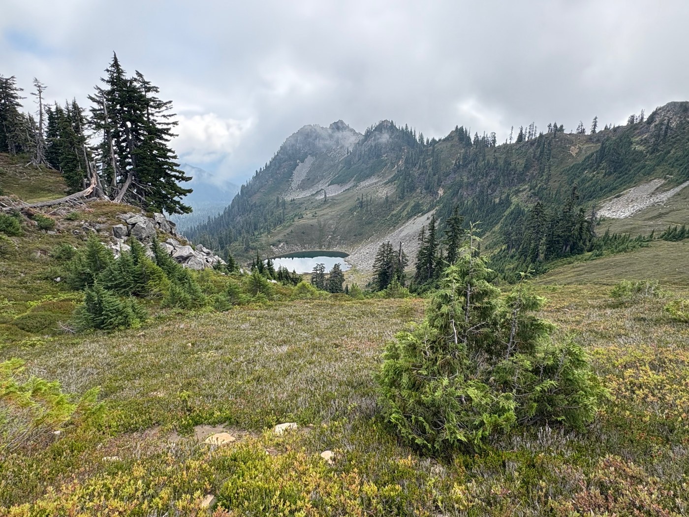 The final ascent toward the look out brought more clouds, but still much to look at including many, many ripe blueberries. Ate a sandwich at the top and took a timelapse of the clouds scooting up valleys and over ridges below me. The view down was mostly obscured, but I won't complain - it was a great hike and experience.