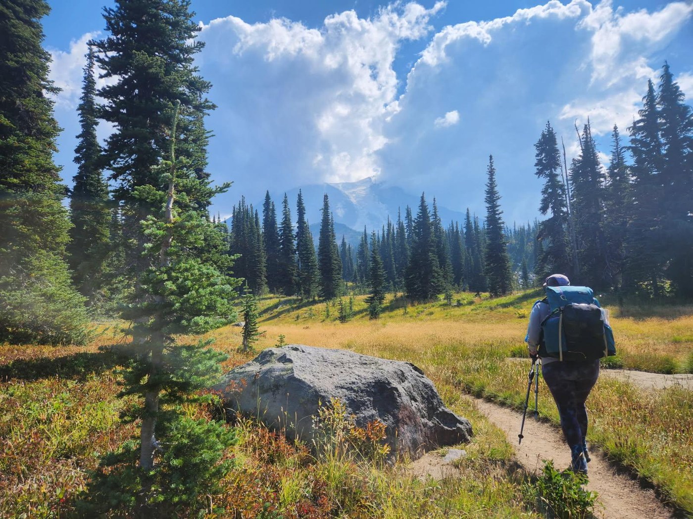 Not too many steps from the trailhead you enter the Mount Adams Wilderness, announced by a sign that was posted about 20 feet high up on a tree. The lower two miles of the trail ascend via a combination of big steps up and some nice gradual switchbacks that appear to have been cut in not long ago by trail crews. We appreciated the gradual switchbacks as it was foggy and humid on our hike in. About two miles in you begin getting views at the first camp. Water there is still running well. There was one stagnant area higher up between the first camp and the PCT junction that you could filter from if you really were desperate, but we chose to continue because we knew Killen Creek was a better source and that's the area we were camping in. Mount Adams was cloudy but as we continued to hike in, the weather conditions improved, and the cloud cover dissipated as we headed north on the PCT. We found a camp in the Killen Creek Meadows area behind Shy Lake which was beautiful and no bugs! We took our stoves and food to the rock that overlooks Shy Lake for a beautiful dinner view. All the clouds had lifted around the mountain, the lake was still for excellent reflection photos, and it was a clear night.