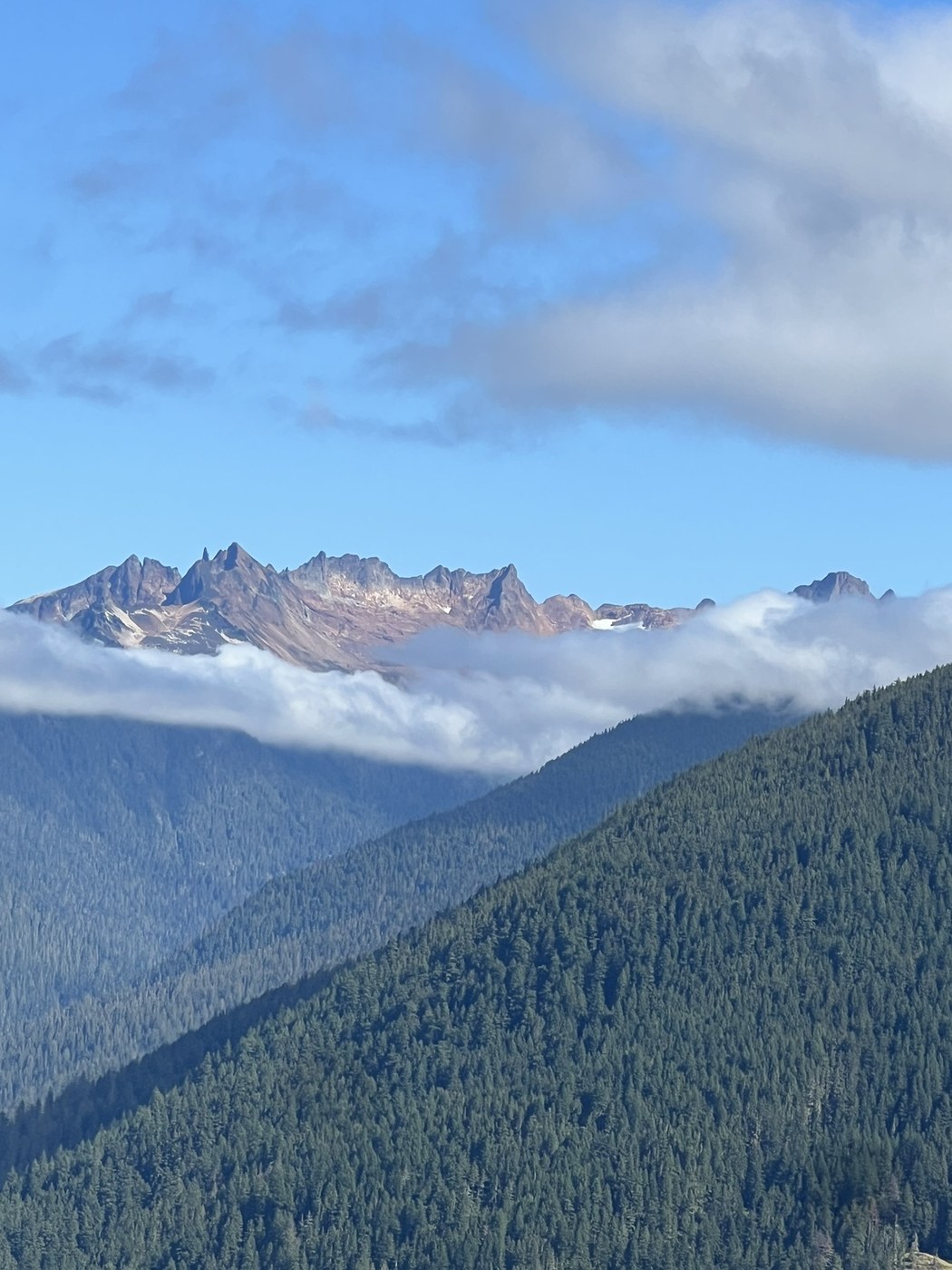 The trail turns to rock and narrows significantly with great exposure between the peak and the true summit. There’s a big rock that requires skirting around to the left on the closest I’ve ever come to a knife’s edge, so I ditched my poles to use my hands for balance. Then I scooted down on my butt where the trail turns back to dirt and dips down for a few of steps before stepping back up. The true summit is wide and flat with space for a bivvy or two. 360 views with the mountain loop highway behind you and the north cascades in front. I’m sure the view of Glacier Peak is stunning but it was blocked by clouds today.