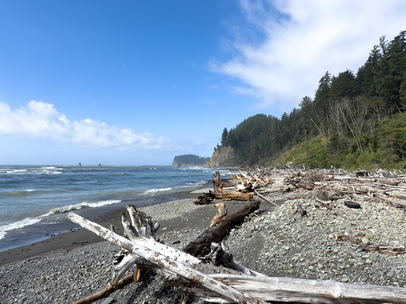 After exiting the forest you cross over a pile of logs and begin the final ~0.3 mi jaunt to the Pacific Ocean over pebbled beach. Birds are everywhere and the sound of the ocean steadily grows louder as you approach. The final reward is a stretch of nearly pristine beachfront with hardly anyone around. The beach itself is rocky and covered in driftwood. We were fortunate to have the weather clear up not long after we arrived. You can see Ruby Beach way off to the south, Destruction Island to the SW, and rocky shoreline to the north. The "trail" continues north along the beach but we turned back.