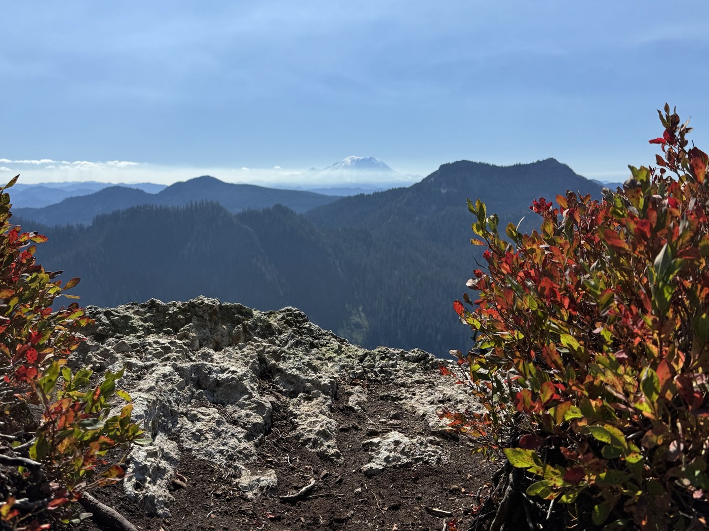 Combining Mt Catherine with the nearby Twin Lakes is a 4.8 mile, 1900ft elevation gain hike. Just wanted to put that up front because I couldn’t find that info before doing it myself today. The trail up to the summit was in very nice condition today and could be done in shorts. There is one tree to go over and one tree to go under and some rocky sections of the trail that might potentially distract rock hounds. But the trail on the other side of the road heading down to Twin Lakes was a bit overgrown in areas. Long pants would be better here and even long sleeves if you’re not too hot. I was glad to be walking on this part of the trail at a dry time of the year seeing how it had pockets of moisture and little streams. I could only imagine how wet it would be right after the snow is melting. Blueberries can still be found out there, more so on the trail down to Twin Lakes. For fall foliage, the reds are definitely making an appearance with an occasional orange and yellow.