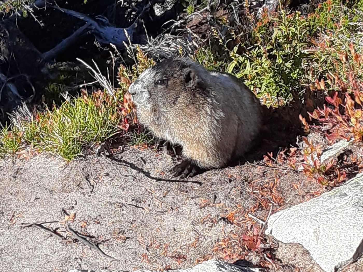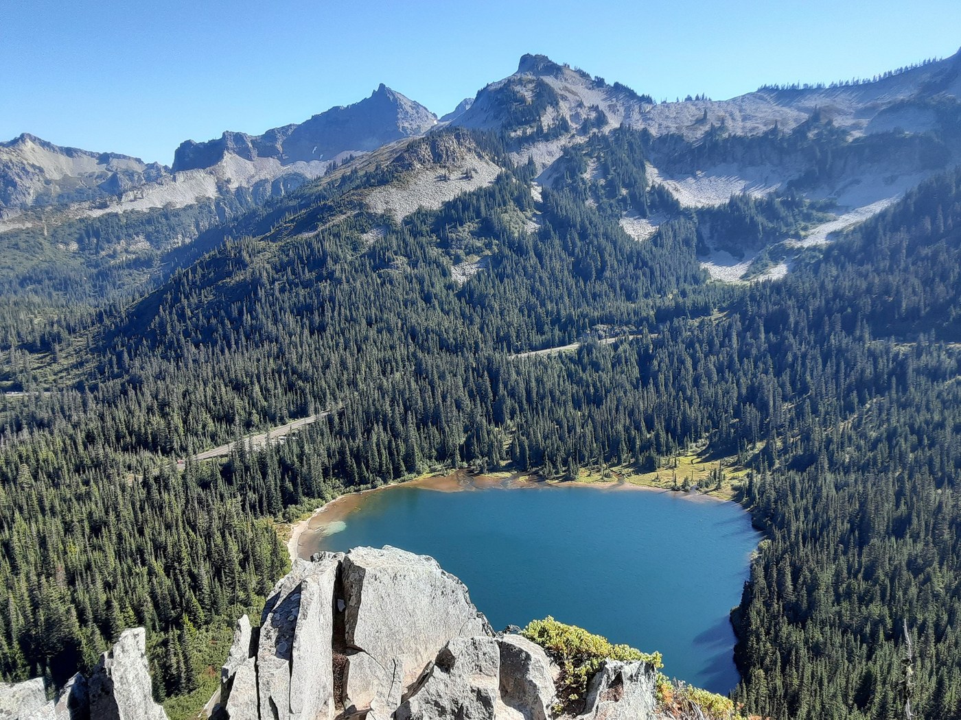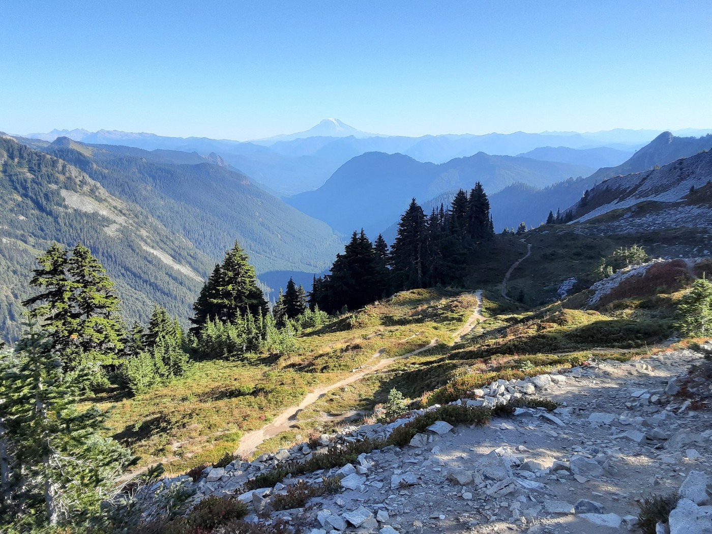 Parked at the westernmost parking lot at Reflection Lakes, followed the High Lakes Loop clockwise, and then finished up with the short-but-sweaty hike up to Pinnacle Saddle. The trail on both hikes was easy to follow and obstacle-free. Plenty of friendly people out on the trails, but neither hike was overrun. One young woman brought her dog to Pinnacle Saddle, brazenly passing several no-dogs signs on the way. Grrr. At least her four-legged companion was on a leash.