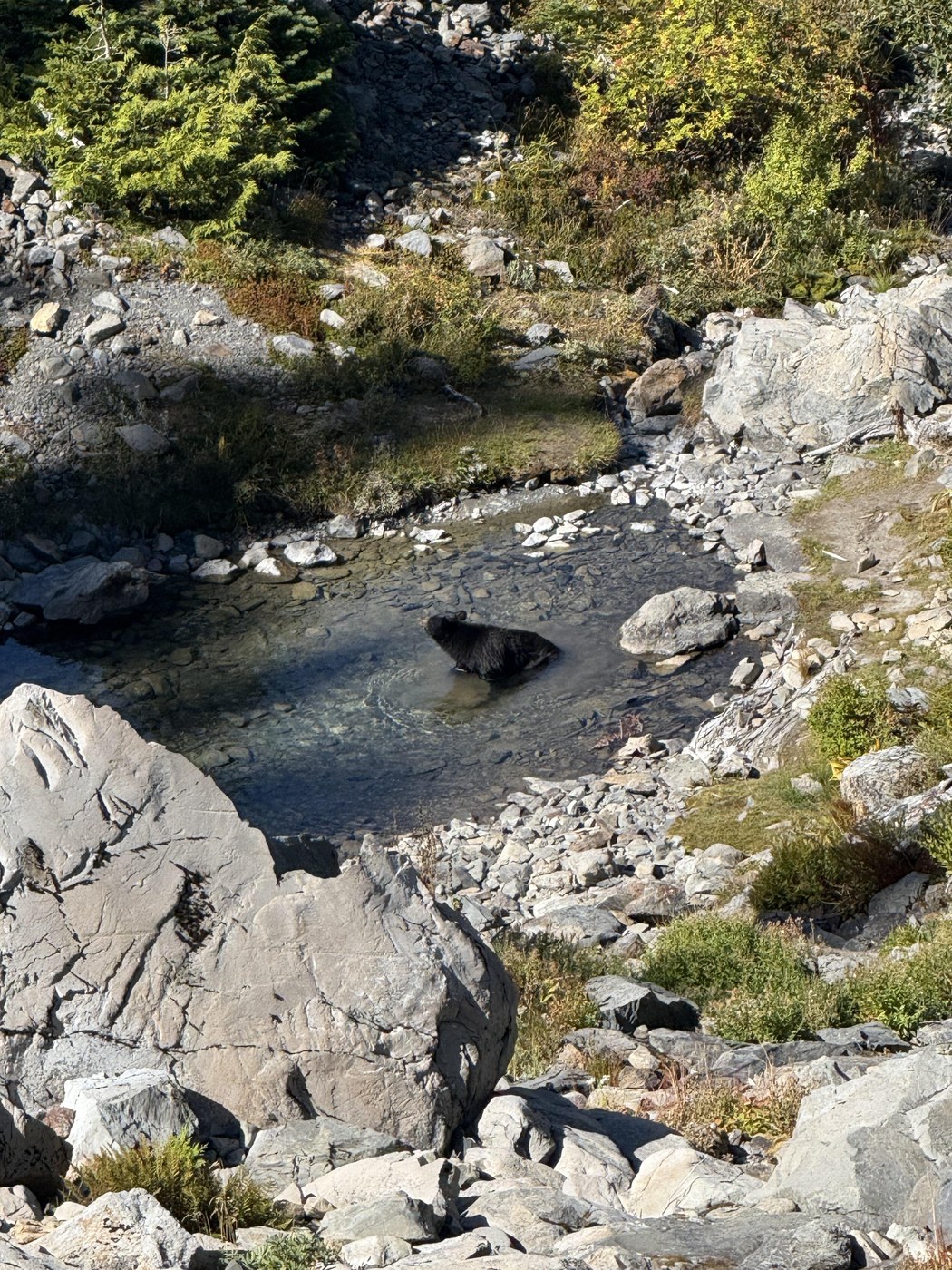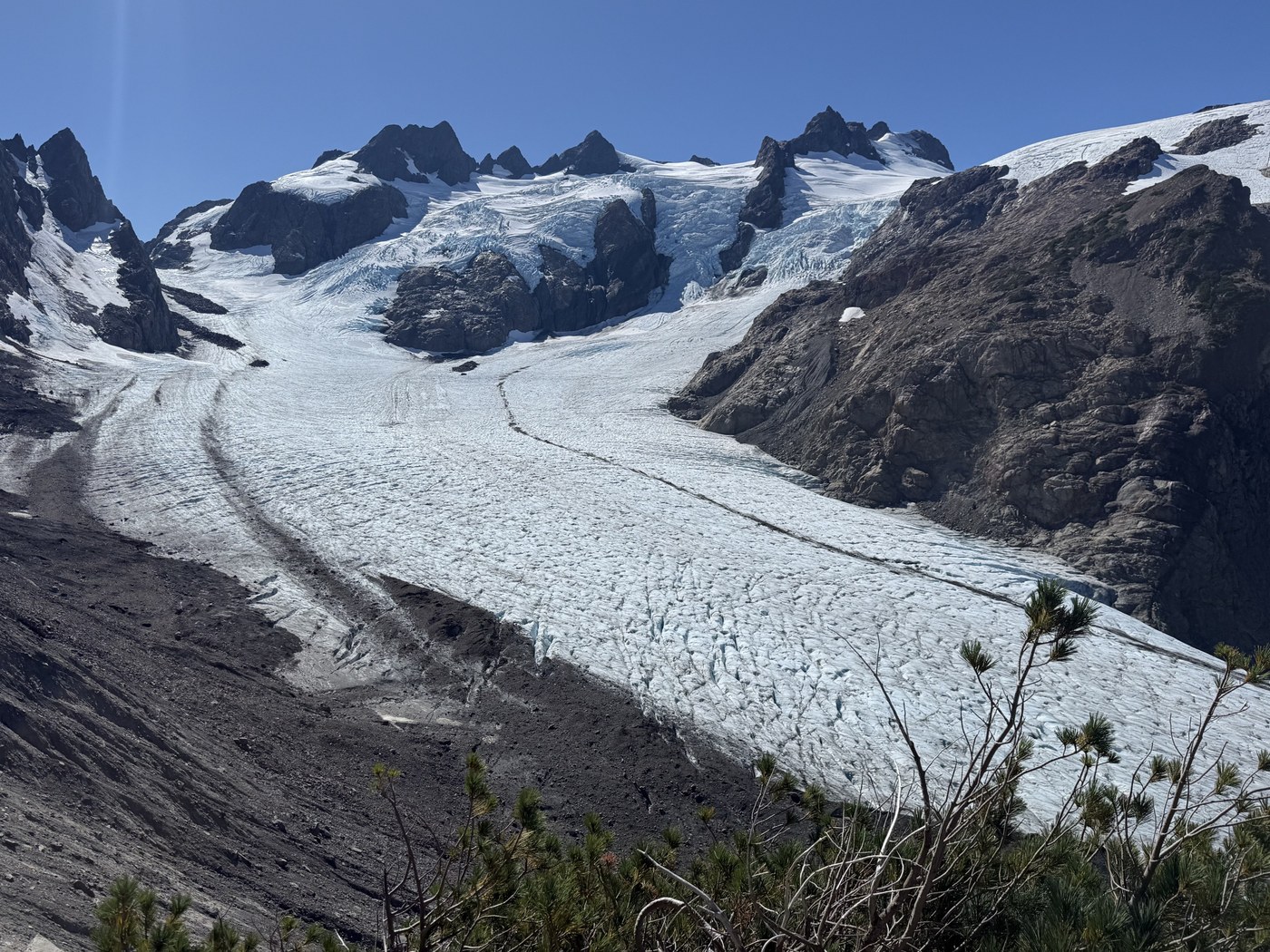 Did this as a long day hike starting at 5:00 am and got back at 8:00 pm. The trail is in excellent shape and well maintained, maybe 5 downed trees across 19 miles. I started in the dark and was startled by a couple elk crashing through the forest. I only saw their eyes in my headlamp which was unnerving. A little while later I saw a large male elk which proceeded to just stare at me. At mile 8 there is 2 river crossings both of which can be avoided by using downed logs. The incline starts a little after Lewis Meadows and is never too bad except the last section from Glacier Meadows to the Moraine. There are some great views of Mt. Tom and White Glacier right before the ladder. It's crazy to think how much the glacier has receded from the LIA, in 1815 it was connected with Blue Glacier. The ladder is a bit tricky due to a couple missing rungs. There is a sign which just has an arrow at Glacier Meadows that indicates the way to the moraine. It's easy to miss and I spent some time wandering among the campsites. I arrived at the terminal Moraine at 1:00 pm and spent 45 min admiring the view. On the way down I encountered a bear bathing in the tarn. It was very cool to see, and I must say bears are much less intimidating than elk. It was in the way of the trail, but it eventually scampered off. At this point I was running low on time, so I picked up the pace and only took 3 short breaks on the way out. I saw two more male elk around 4 miles out from the parking lot. Stats 38 miles, 6300 ft of gain.