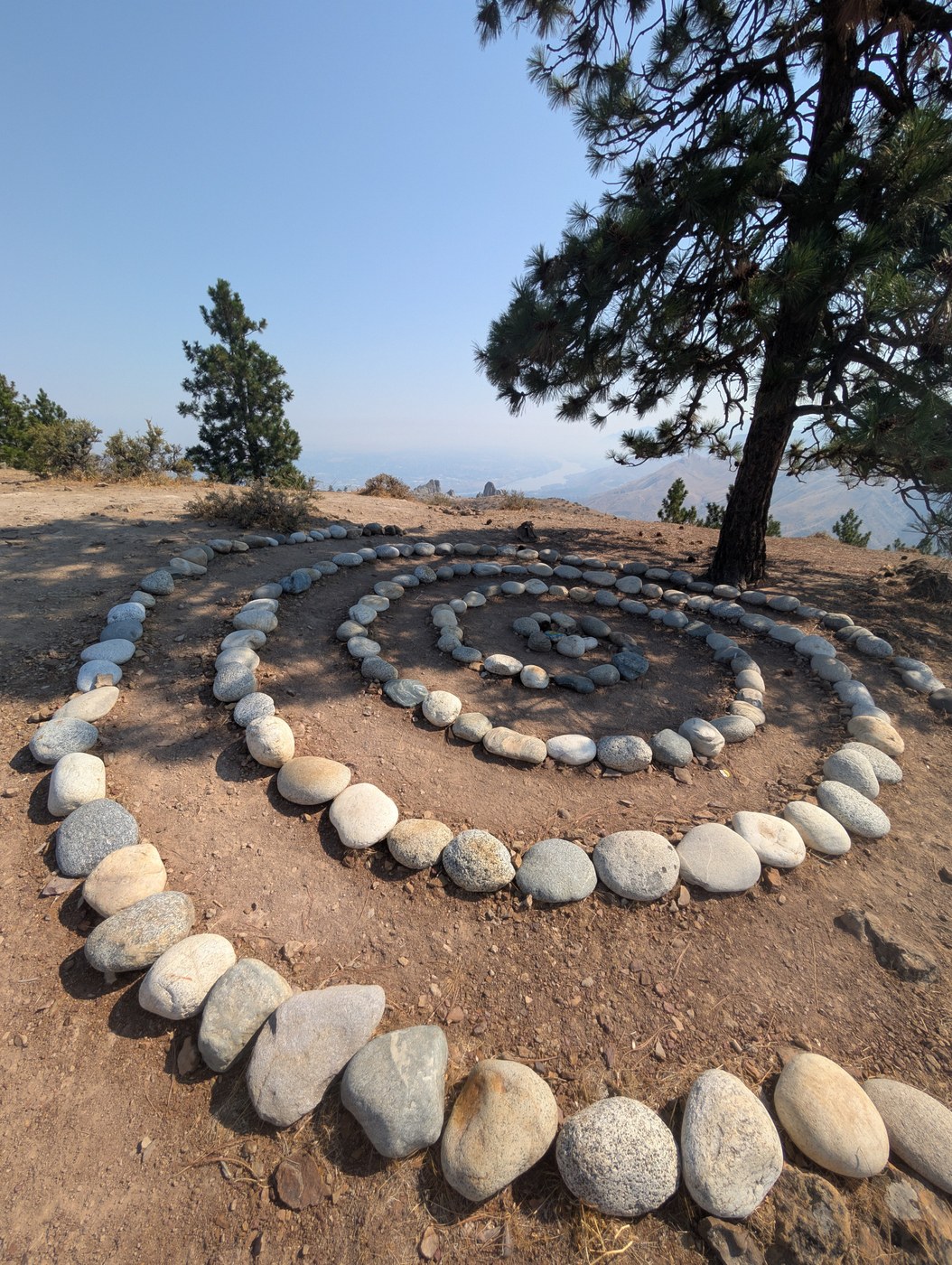 Looking ahead, the trail made a rise up to a little stand of trees where I was surprised to find a spiral labyrinth made out of river rock. Very unexpected. Someone had to carry all those rocks all the way up here! Naturally, I had to try it out, and wondered if I looked a bit silly from afar - some guy wandering around in circles on top of the ridge. I must not have been in the proper frame of mind when I started my inward journey because nothing mystical or spiritual occurred at the end. Instead, I only found another rock with a flower painted on it. But just in case I had accidentally soaked up some good karma, I carefully retraced my steps back out. You always want to make the full journey, for if you take a shortcut and step over the spiral, you instantly break the spell and have seven years of bad luck. (OK, I just made that up, but it sounds like it could be a thing.)