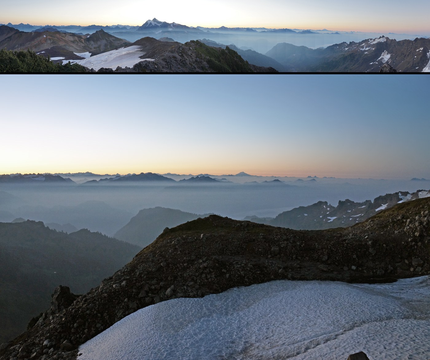 I left the Artist Point parking lot at 3:10am for a starlight hike and to see a sunrise at the East Portal. At that time, there was no local smoke apparent. There was a darkened horizon looming to the south which by dawn pushed a thick layer of smoke into the valleys to the south and east. Before the sun caused the smoky haze to rise, the deck of smoke was sharply separated from the cleaner air above giving the early dawn scene a very prehistoric ice age sort of look. Luckily, the East Portal and Baker scenes remained clear of smoke and haze for sometime after sunrise. On the return, the haziness slowly increased as I went lower in elevation and farther east to the parking lot. The upper reaches of Baker were dusted with a small amount of new snow from Sunday’s little storm. This dusting created an unusual pattern of tiger stripes on the Park Glacier Headwall. There was only one small stretch (maybe 50 ft long) of snow anywhere on the route. In the dark this snow bank was rock hard and very slippery ice inbound, but on the return, the sun had quickly made passage across the snow bank very easy.