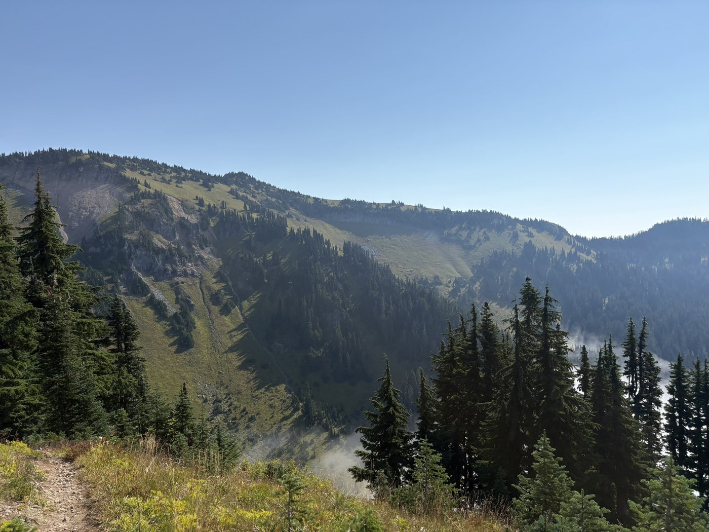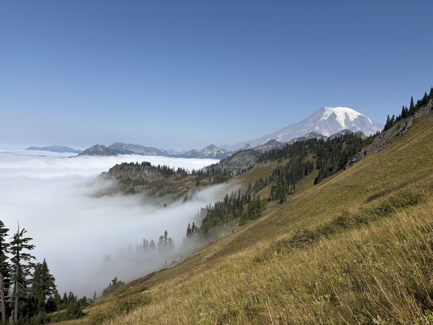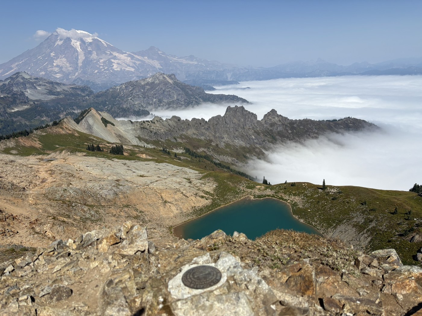 We had great views and one guy in our group even strafed down to the small lake about 300 feet below the peak (not Tatoosh Lakes) for a swim.