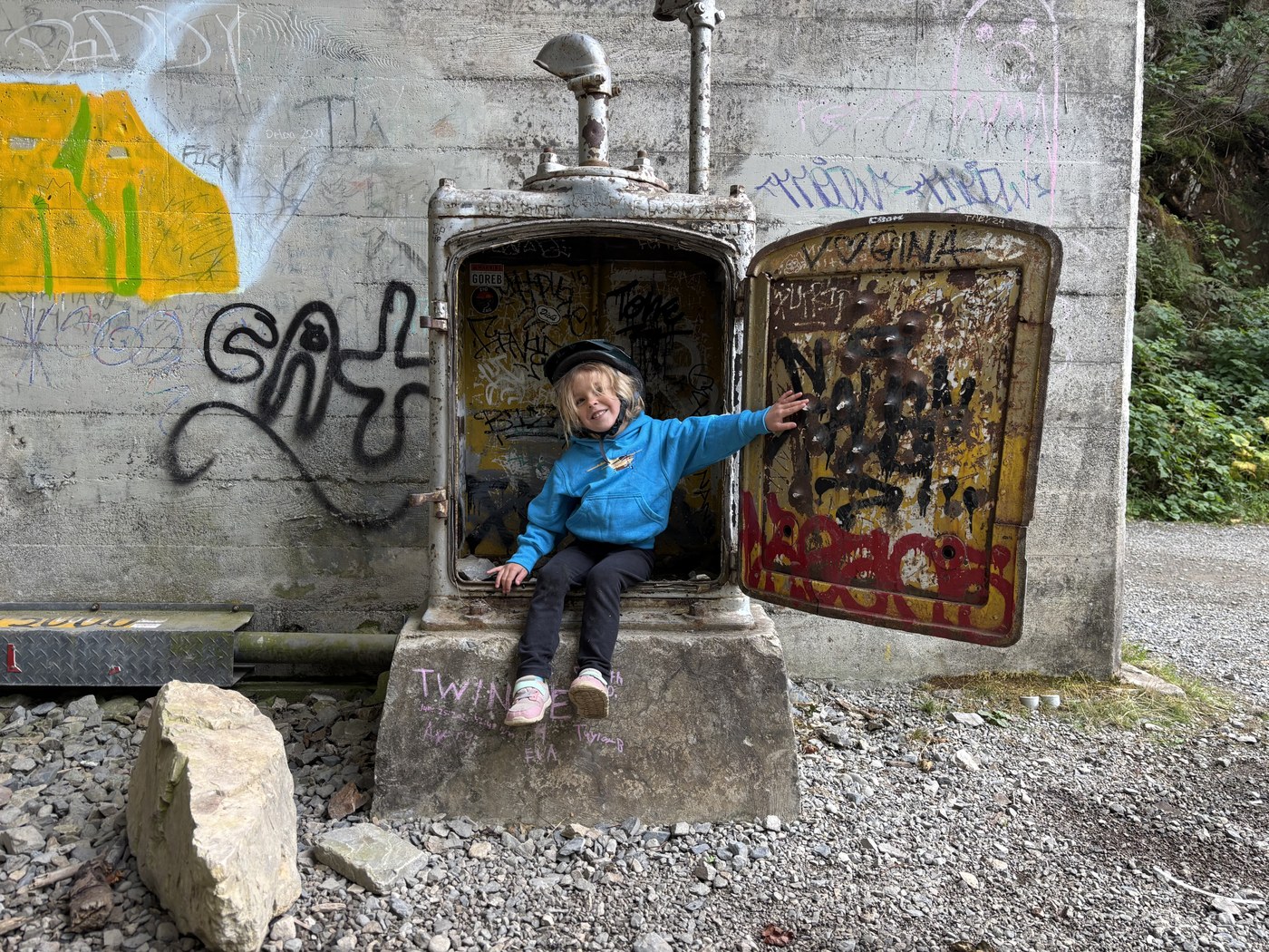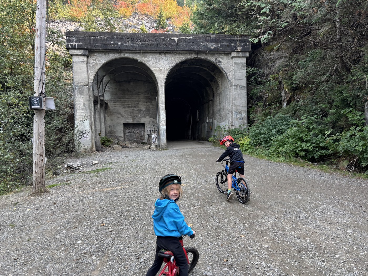 Pretty smoky out from the Labor Mountain and Lower Sugarloaf Fires hopefully the rain will help clear it up a bit. Kids were initially interested in the idea of a long tunnel ride from past cave hikes but they didn’t particularly enjoy the cold and length of the tunnel. Plenty of artifacts to explore and the kids noticed the vine maple colors on either side of the tunnel but this may be a one time bike until the kids get older. Maybe avoid the Snoqualmie corridor until the rain finally comes to improve smoke conditions.