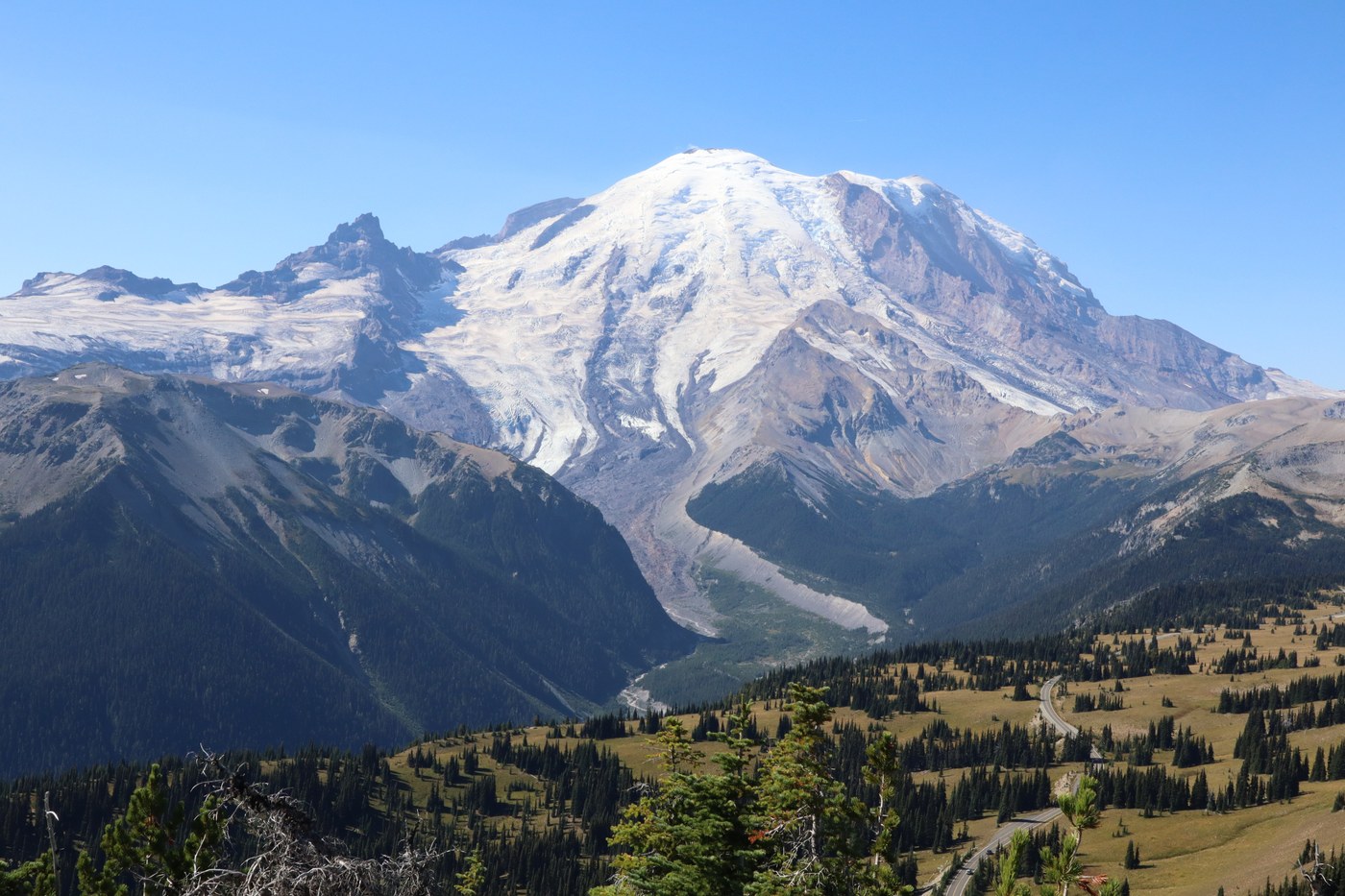 Many times, I had done hikes out of Sunrise, always to the left-hand side toward the Mountain, and the interchange of trails there. This time my hiking companions and I took a right above the parking lot at Sunrise and hiked the ridge trail above the road to Dege Peak and out to Sunrise Point. A beautiful clear and fairly warm end of summer day. Arrived at the lot at about 10:30 after an almost three-hour drive of detours due to the Buckley Bridge not being accessible. Dry and often exposed trail looking down on the Sunrise Road, then the short left-hand trail up to the summit of Dege (7,008 feet), with a commanding view of the surrounding area--the valleys on the opposite side, Sunrise Lake, and Sunrise Point in the distance. Way off to the other side, Grand Park. We stayed on the summit for an hour, then continued along the ridge, which descends down to the parking/viewpoint area of Sunrise Point. Then the climb back up to the Dege junction! Returned to the parking lot at 2:30. Miles: 6.2; Wildlife: gray jays, marmots, chipmunks.