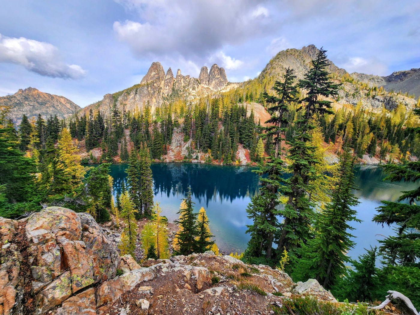 Took my friend from California on a golden larch adventure - spent 2 nights in Winthrop and did three hikes total. On Thursday afternoon we stopped at Blue Lake. It was busy - parking lot was full and we were the second car on the road - but not nearly as bad as on Saturday afternoon when we saw cars parked a looong way down Hwy 20. Easy, steady grade, well-maintained trail with colors popping right now even before you get to the lake. Larches are all different shades, from lime to deep orange. I highly recommend taking the small loop around the tarn, it felt quieter and there are still a few huckleberries clinging for dear life and loaded with sweet goodness. Bathroom at the start of the trail was well-stocked and clean. Highly recommend doing this trail on a weekday. For those preferring low elevation gain but wanting a longer hike, Blue Lake can be paired with Cutthroat Lake (trailhead is about 10 minutes further east on Hwy 20), another short easy hike with uniquely different peaks and lake.