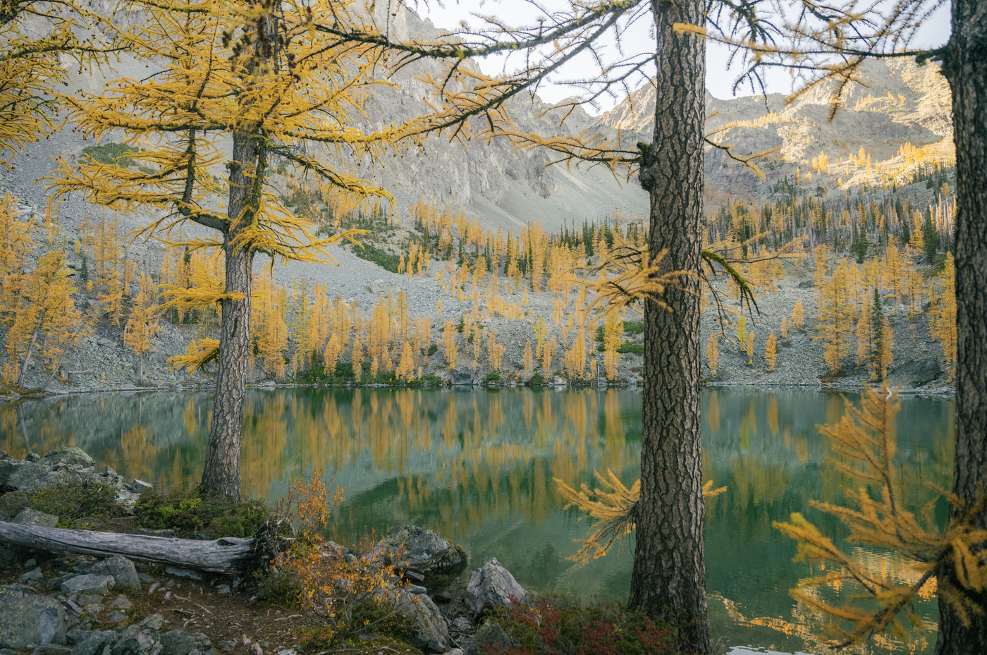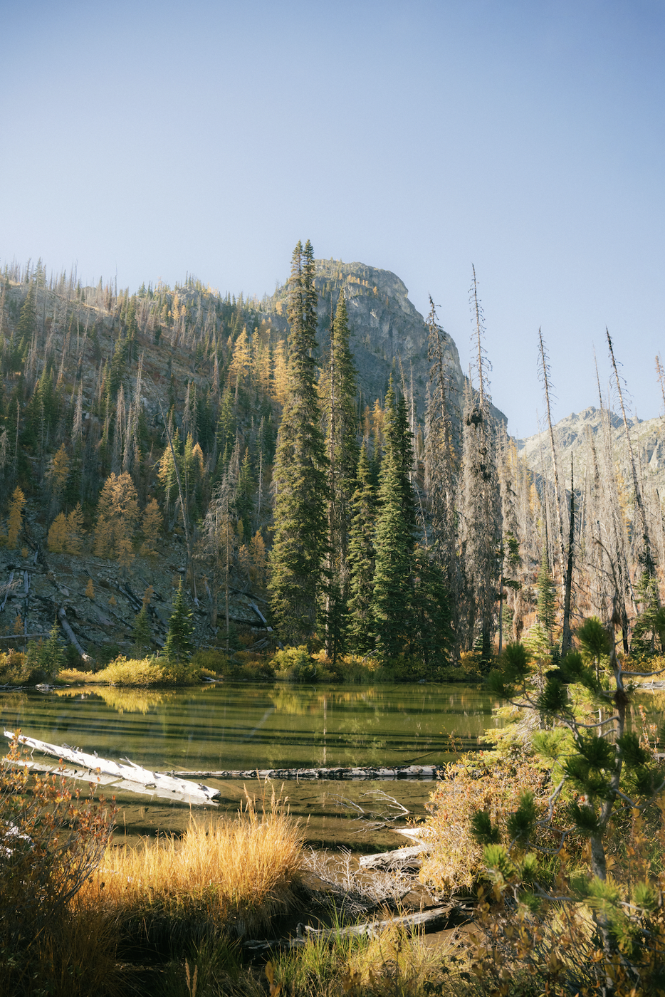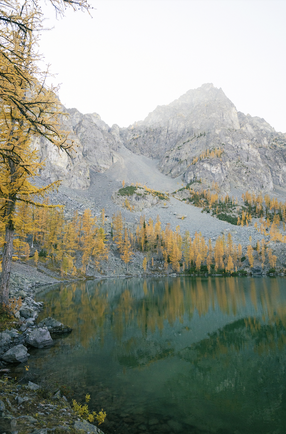 Larches are stunning right now and contrasted beautifully with the blue green tone of the lake. We also noticed that a lot of the rocks on the ground, as we got closer to the lake, had green tints from copper deposits.