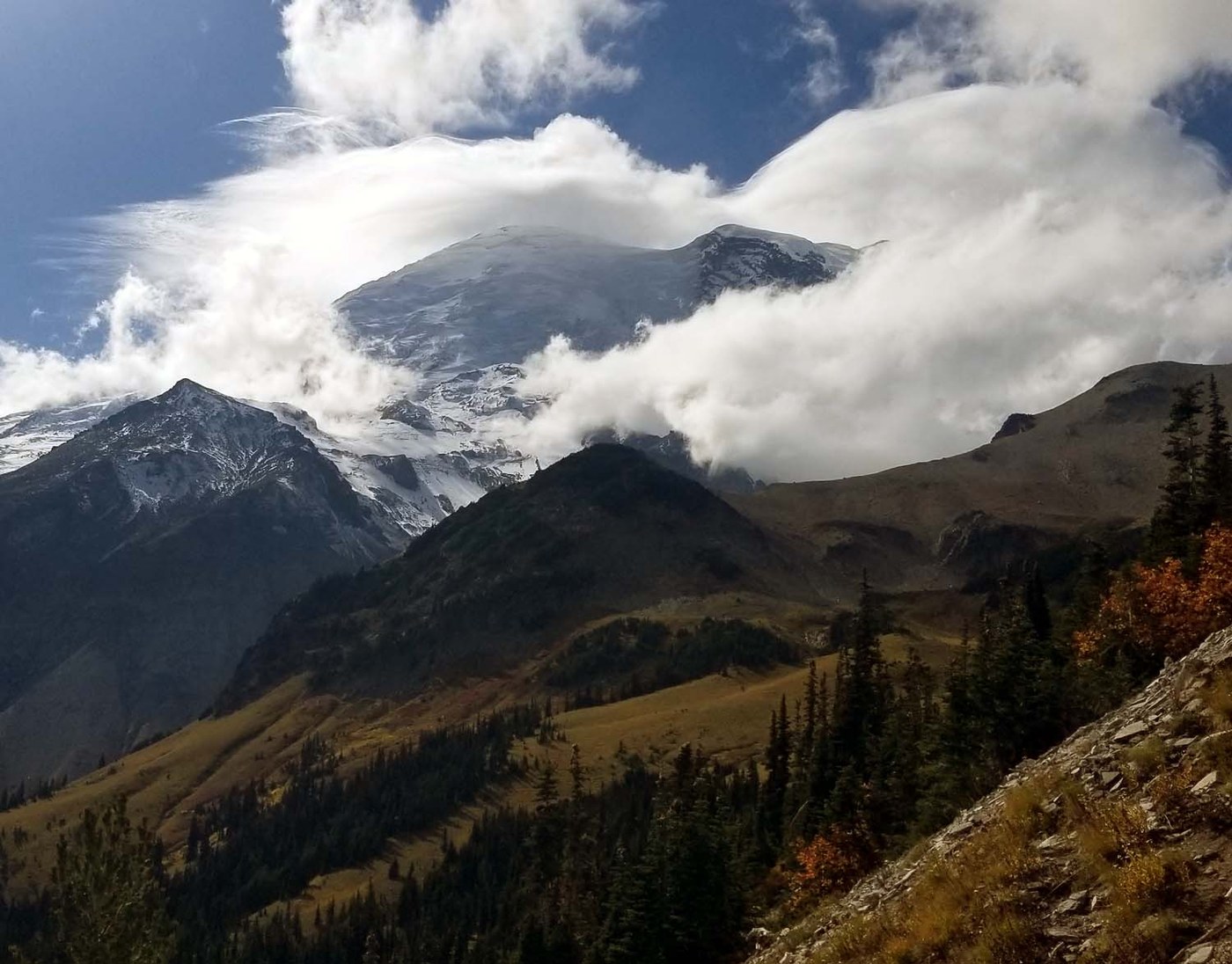 Epic is an understatement. This hike (10.25 miles/3000 ft.) on a day such as this was one jaw-dropping view after another. The temps stayed in the 40's all day. Great views in the morning, then the clouds. The blue sky was roiled by swiftly moving clouds; just added to the views. Sunrise Road is closed and our contacts with humans was almost zero until on the Glacier Basin Trail on our return to the WRCG. We think CCW is the way to go. After the initial part of the Wonderland, great views abound until back on the GBT.