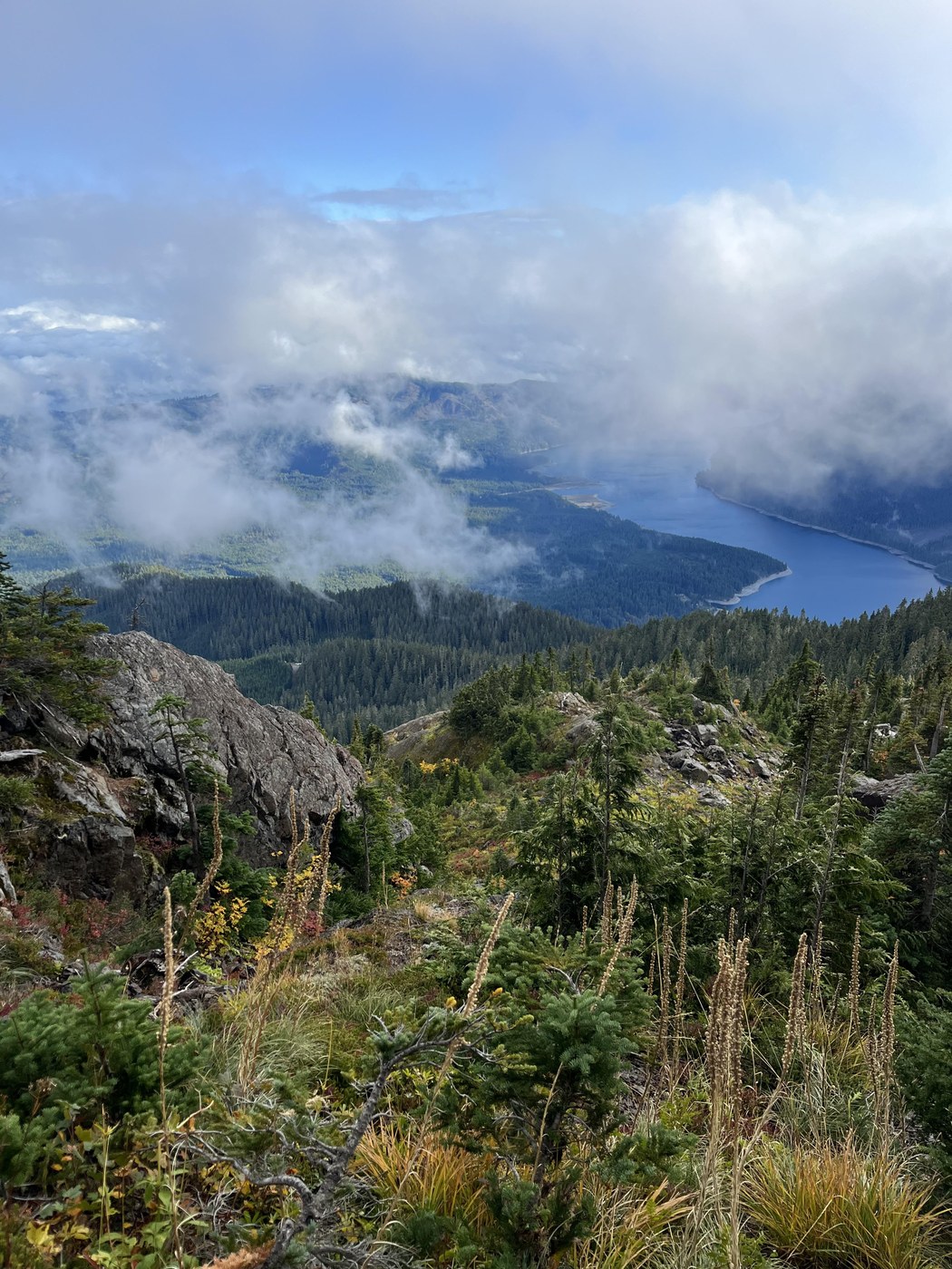 It misted on us a bit, but I only wore my raincoat for the second half of the hike (when I wasn’t sweating as much!). The summit was clouded over, but on our way back down, the clouds cleared for a few minutes and we had great views of Lake Cushman. Our short outing took us about two hours. Glad I was able to visit Ellinor before snow starts making the summit route less accessible.