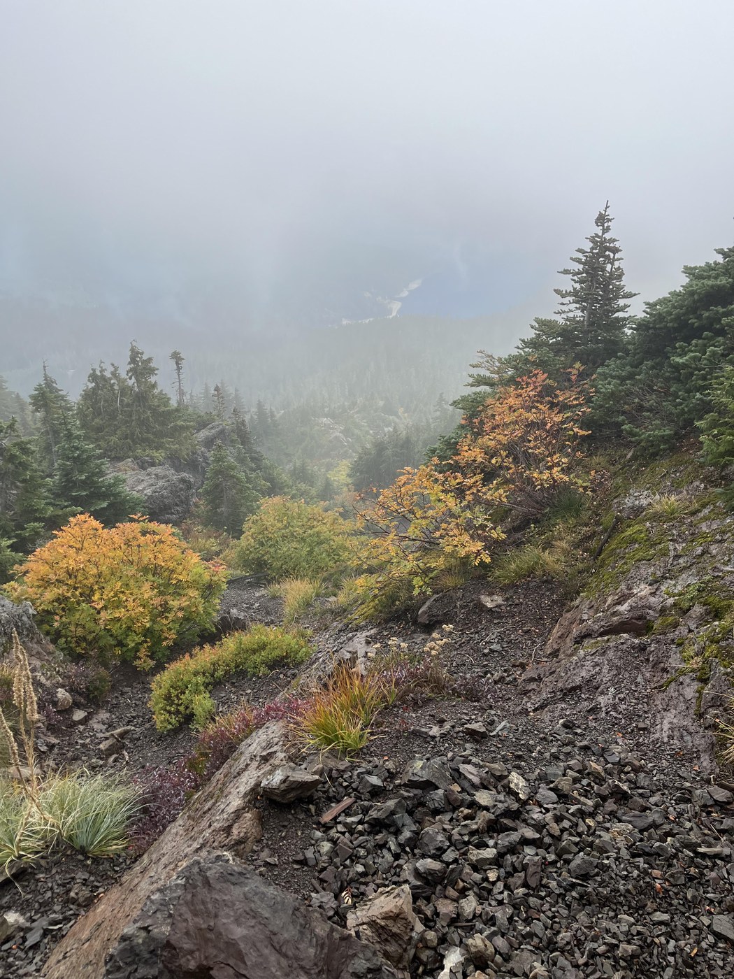 I love this portion of the peninsula, and so I was both nervous and anxious to visit it after the closure. Because of today’s clouds, I saw no signs of the Bear Gulch fire. Instead, Mt Ellinor from the upper trailhead felt and looked like it often does during fall: a leg burner from the start, low visibility from the clouds, but beautiful and quiet. The rocks underfoot were slick, but we took our time and didn’t have any issues.