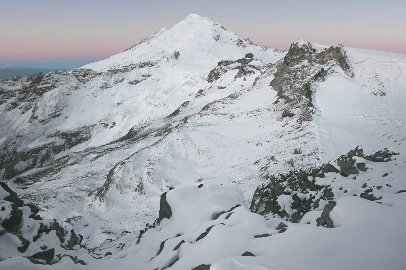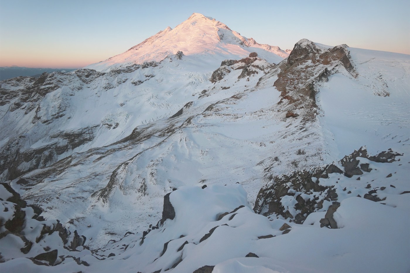 Surprising to me, the full length of the road to the Artist Point parking lot remained open after the Sunday storm and there was some sanding on the last stretch. This is the first time in over ten years living in Bellingham that I have seen them treat that stretch of the road rather than just closing it. I left the Artist Point parking lot at 4:20am for a starlight and last quarter moon hike and to see a sunrise at the East Portal. Since I left about a half an hour later than I should have, I had to make up about a half an hour from my usual pace to get to the portal in time and didn’t really get any star gazing in. In the dark, basically any part of the trail that wasn’t snow covered was glazed with ice. Very little snow is on the route before the Chain Lake Loop junction. Descending down into Ptarmigan Ridge Trail from there are some very thick icy stretches. The snow depth out to the Camp Kiser area only exceeded a couple of inches in short drifted stretches. By the time I reached the base of the East Portal, snow depth was up to 5 or 6 inches and on top of the portal, 8 to 12 inches was the norm. The clear air and views today were breathtaking and I stayed on the portal for two hours. Didn’t encounter anyone else until arriving back at the Goat Lake viewpoint (didn’t look at all frozen, yet). From there, there were about a dozen others on Ptarmigan Ridge, though many more were encountered after returning past the lake loop junction. A lot of the icing on the lower trail after the junction melted out in the sunlight, but became a bit muddy. These conditions will probably only hold for another day or two as more stormy weather is forecast for Thursday night.